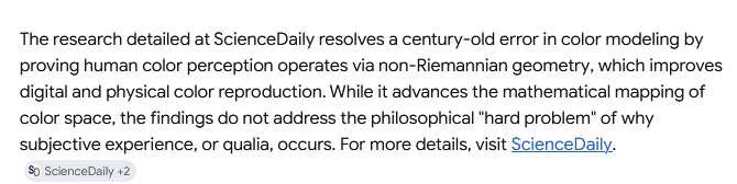 >>18416684>cannot explain qualia, because there is no objective metric by which it can be measuredLiterally false. A major paper just came out explaining color geometrically.
