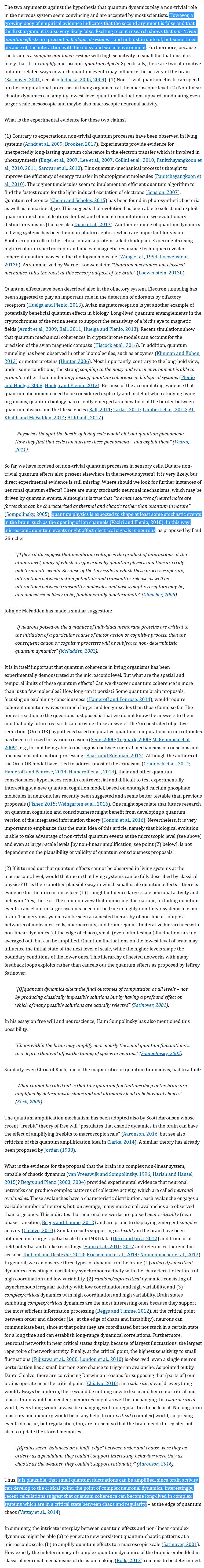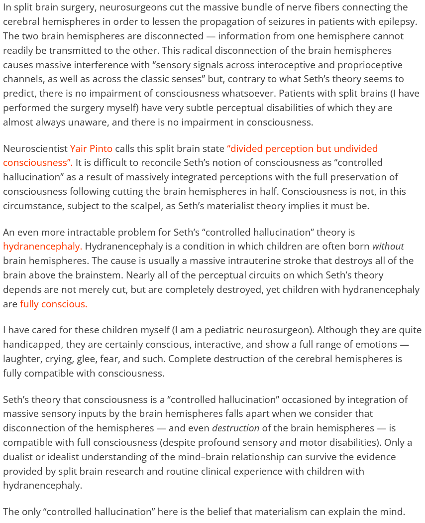 >>18418791If you want some explanations behind the names, here's some highlights:>Stanislas DehaenePioneer of neuroimaging, winner of the brain prize (basically the fields medal but for neuroscientists). I don't like bringing the muh citations argument but he has an absolute shitton of them and an h index of almost 200.>Joseph LeDouxMade important contributions to neuroscience like discovering the amygdala’s role in fear conditioning, also extremely recognised and has a shitton of citations>Scott AaronsonNot a neurologist but an accomplished quantum theorist, which is particularly funny considering all of the dualistbabby "muh quantum" discussions ITT.>Michael GrazianoMade important contributions regarding motor cortex and spatial attention.And so on and so on.