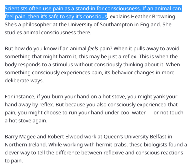 >scientists often use pain as a stand in for consciousness, explains Heather browning >she's a philosopher >she studies animal consciousness