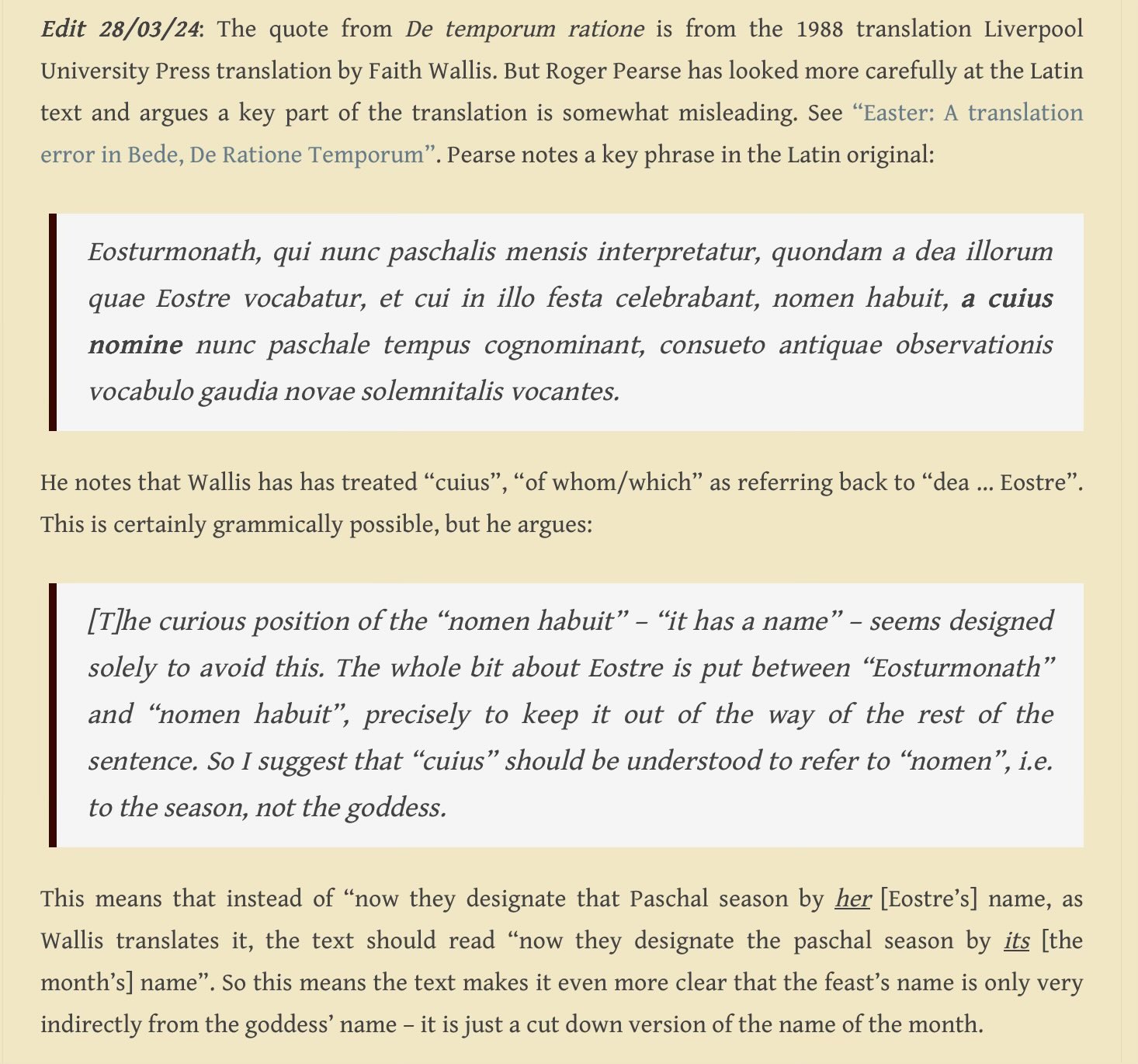 Finally, Eostre being the Cognate of Eos, Aurora, Ushas and Zorya is enough to correlate the evidence in Bede in the absence of counter-evidence. It would be far more absurd to conclude that Germanic traditions don't have a dawn goddess and that this goddess wasn't connected with the Eostre month / festivals.