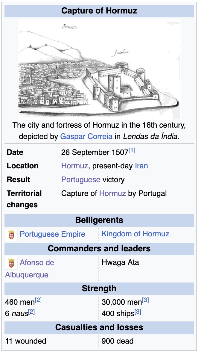 >be 1507>Portuguese Empire just getting started in the Indian Ocean>Afonso de Albuquerque rolls up with only 460 men and 6 ships>target: Kingdom of Hormuz>they got 30,000 men and 400 ships>65 to 1 manpower disadvantage>66 to 1 naval disadvantage>still capture the city and fortress in one go>Portuguese casualties: 11 wounded>Hormuz casualties: 900 dead>proceed to build a massive fort there like it's TuesdayDayum bros... how did the Portuguese keep getting away with this shit?Were they just built different?