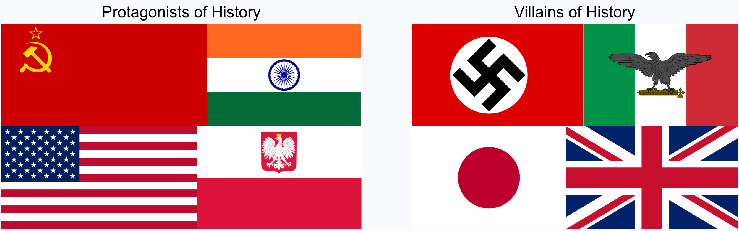 >>18422440Every nation becomes evil either once it's big enough or to get big. Every single nation in OP's pic has invaded a weaker neighbor. Except Poland, but they'd invade Russia today if Germany let it.