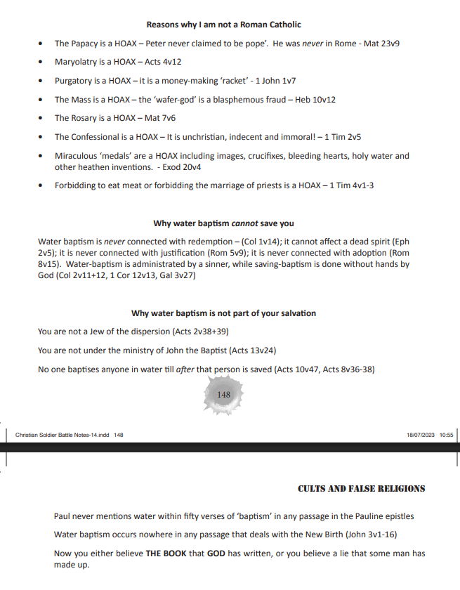 >>18427739Galatians 1:6-9"I marvel that ye are so soon removed from him that called you into the grace of Christ unto another gospel: Which is not another; but there be some that trouble you, and would pervert the gospel of Christ. But though we, or an angel from heaven, preach any other gospel unto you than that which we have preached unto you, let him be accursed. As we said before, so say I now again, If any man preach any other gospel unto you than that ye have received, let him be accursed."The Catholic church is a pawn satan used to destroy Bibles and murder Christians to replace them with heresy. The catholic church is continuing pagan rituals, it is not Christianity just because the mother and son worship that is common in pagan rituals is replaced with Jesus and Mary. Not the mention how depraved and evil the priests of the religion are. The Catholic church is the very act of trying to earn righteousness with your works, ignoring what God says.Mark 7:7“Howbeit in vain do they worship me, teaching for doctrines the commandments of men."The Mass is the unbloody sacrifice of the body and blood of Christ. Is the Mass the same sacrifice as that of the Cross?The Mass is the same sacrifice as that of the Cross. This is anti-Scriptural - Heb 7v27, Heb 9v11-15+26+28, Heb 10v10-12+14+18, 1 Pet 1v18+19 The Scriptures are perfectly clear that the Lord Jesus Christ was offered once, it was a perfect sacrifice and shall never be repeated. The Mass is not only a mess, it is Satanic ritual.Acts 13v39, Rom 3v28, Rom 5v1+9, Gal 2v16, Gal 3v11+24, Gal 5v4, Titus 3v7, Rom 4v25. We are justified by faith, by the Blood of Jesus Christ and by His resurrection. The moment you trust Christ for your sins forgiven you receive imputed righteousness and justification; it all happens at the new birth. Works has nothing to do with your justification in this dispensation, absolutely nothing."https://download.timefortruth.co.uk/docs/Christian_Soldiers_Battle_Notes.pdf