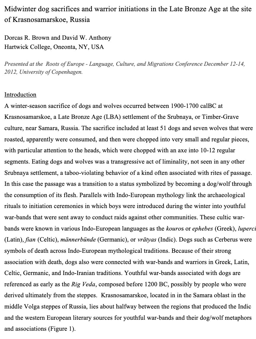 >>18427796Isotopes suggest men from Corded Ware and Bell Beaker cultures traveled to other regions and returned. It's speculated these trips might've been warrior "excursions", like those by Germanic and Celtic peoples, involving mercenary work or raids. There are also references to warriors using animal symbols, like wolves, in cultures like Scythians, Germanic tribes, Lombards, and Dacians.>At the end of four years, there was a final vrtyastoma sacrifice to transform the Dog/Warriors into responsible adult men who were ready to return to civil life (Kershaw 2000:63). They discarded and destroyed their old clothes and dog skins. They became human once again and were welcomed back into their villages as members of the community.