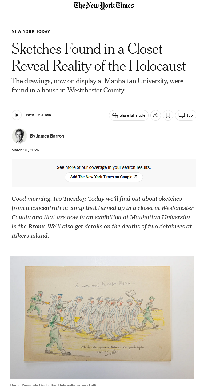 >>18431085>Sketches Found in a Closet Reveal Reality of the Holocaust>The drawings, now on display at Manhattan University, were found in a house in Westchester County.>Good morning. It’s Tuesday. Today we’ll find out about sketches from a concentration camp that turned up in a closet in Westchester County and that are now in an exhibition at Manhattan University in the Bronx. We’ll also get details on the deaths of two detainees at Rikers Island.>Credit...Marcel Roux; via Manhattan University, Anissa Latif>If no one had noticed a leather satchel that had been forgotten in a closet — if the satchel had been thrown out — an art exhibition that opened last week could not have happened.>In the satchel were more than 20 chilling sketches — a man in a prisoner’s uniform being beaten, prisoners amid the emaciated bodies of other prisoners, prisoners in a line for food.>The sketches are from a concentration camp at the end of World War II, the work of someone who survived: a member of the French Resistance named Marcel Roux. They are on display at the Holocaust, Genocide and Interfaith Education Center at Manhattan University, a Lasallian Catholic institution in the Bronx.>The university said the story behind the exhibition started in 1993, when Kenneth and Helene Orce bought a house in Westchester County. The seller was Ruth Epstein, a widow whose husband, William Epstein, had been an Army doctor in World War II. William Epstein, who was later an obstetrician and gynecologist at Mount Sinai Medical Center in Manhattan, died in 1990.>The Orces renovated, as new owners do. In a closet they found the satchel. It was apparently William Epstein’s from the war. The only marking on it was a piece of tape with the words “Capt. Epstein — Please Return 20 Field Hosp.”>The bag had been left behind when Ruth Epstein moved out. The Orces asked whether she wanted it. She did not.