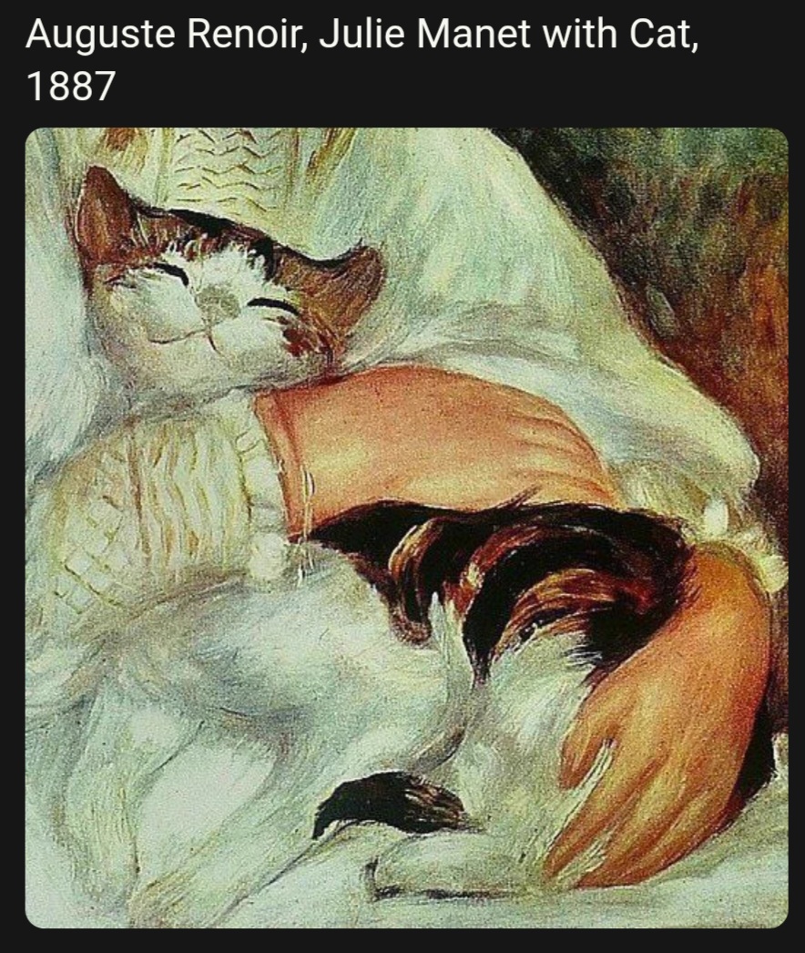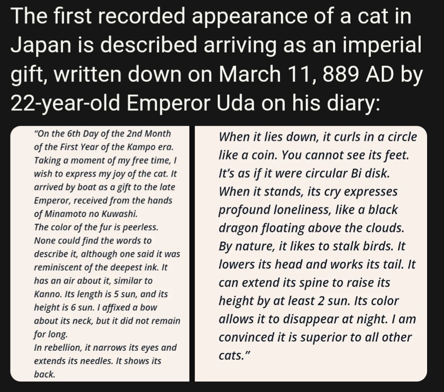 >>18431747That's a mistranslation but the actual text is even kinoerhttps://www.linfamy.com/p/this-popular-cat-loving-letter-from>[...] It seems to enjoy practicing Taoist breathing and stretching exercises, its movements resembling exactly the Five Animal Exercises. It often keeps its head low with its tail touching the ground, but when it arches and stretches its back fully, its height reaches about 2 shaku (about 61 cm). Perhaps this skill in breathing and stretching explains why its fur is so sleek and glossy. Furthermore, its skill in swiftly catching mice at night surpasses other cats.>[...] I once spoke to it, saying, “You embody both yin and yang energies, complete with all your faculties and senses. If indeed you have a heart, surely you must understand me?” The cat sighed deeply, lifted its head, and gazed up into my face. It seemed filled with deep emotion, unable to speak.