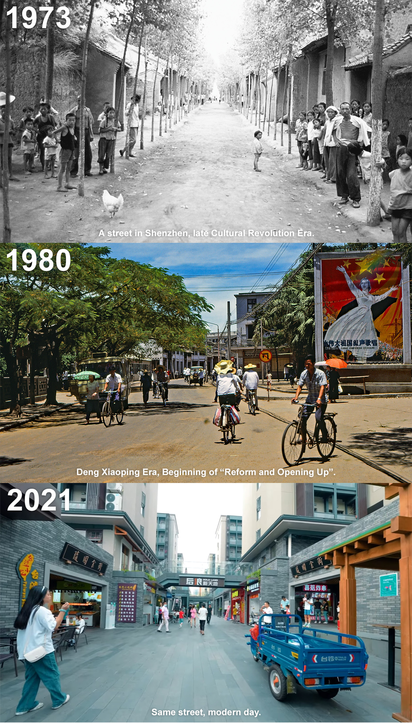 It's not the same street. Look at the trees in the top and middle, they don't match and neither does the placement of buildings. Top seems like a suburb or suburb adjacent (see the chicken), middle seems like a regular roadway in a non-suburb area, and bottom is a commercial district with shops everywhere. Y'all fall for this shit so easily.