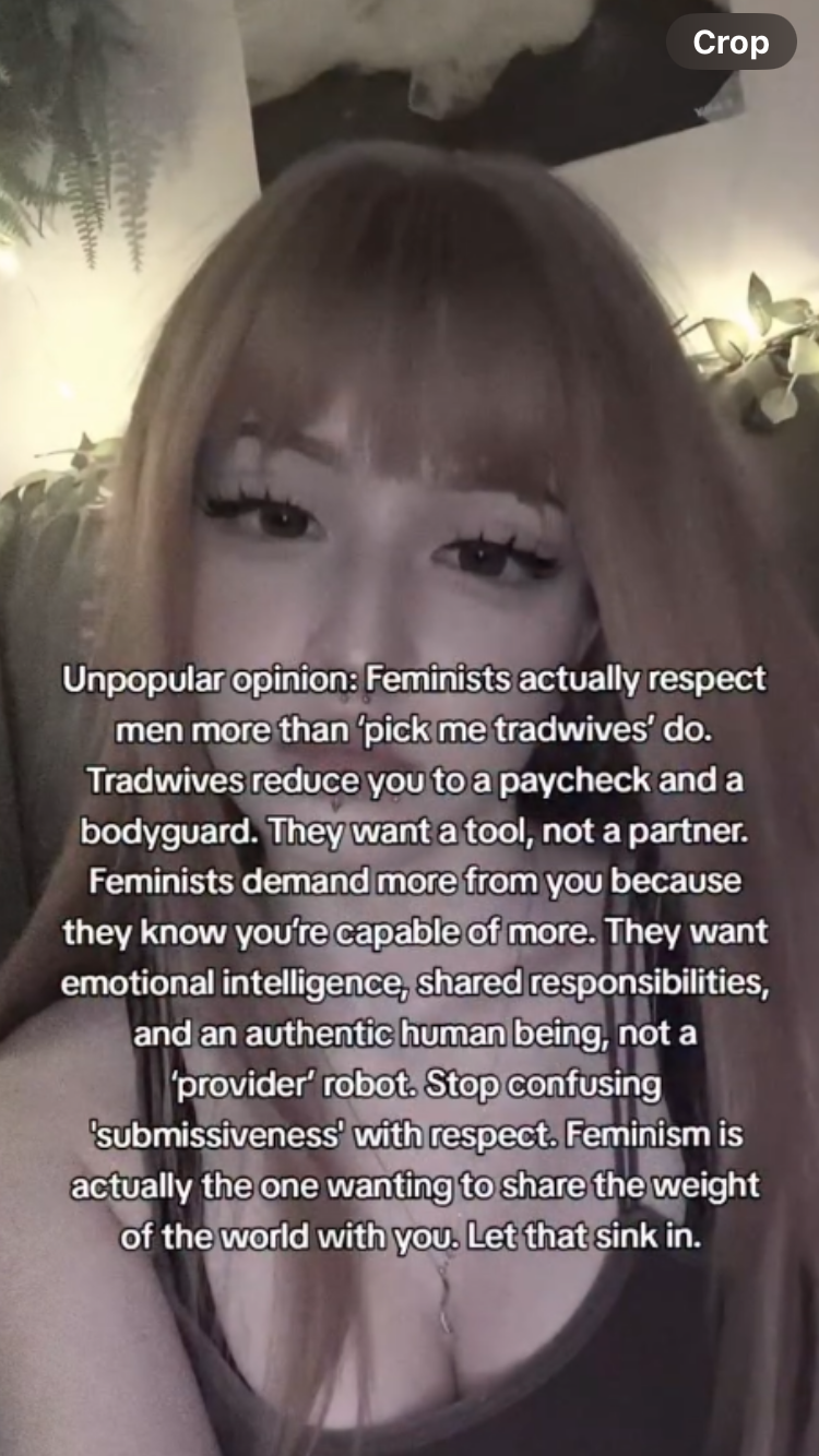 its true the tradwives dont actually submit to you and they demand shit but feminism demands a lot too im single for life for a reason man. just kidding goddess forbids me from having sex thats the reason.
