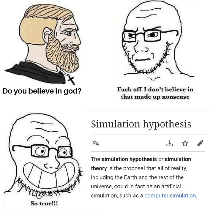 >>18441756So your argument right now is that Christianity is true because the simulation hypothesis could be correct, and it could be that Jesus of Nazareth created this world by constructing a supercomputer in a meta-reality and ran a simulation on it.That's not a very strong argument lol.