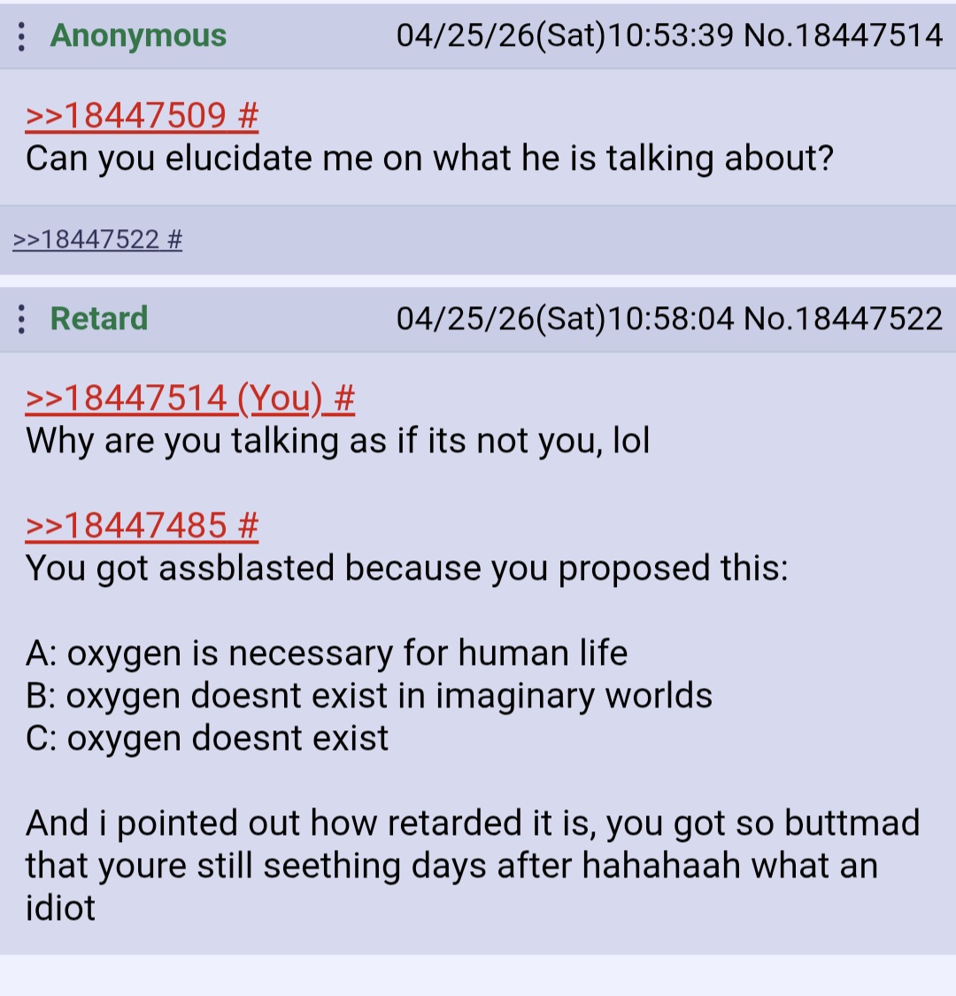 >>18447514Why are you talking as if its not you, lol >>18447485You got assblasted because you proposed this:A: oxygen is necessary for human life B: oxygen doesnt exist in imaginary worlds C: oxygen doesnt existAnd i pointed out how retarded it is, you got so buttmad that youre still seething days after hahahaah what an idiot