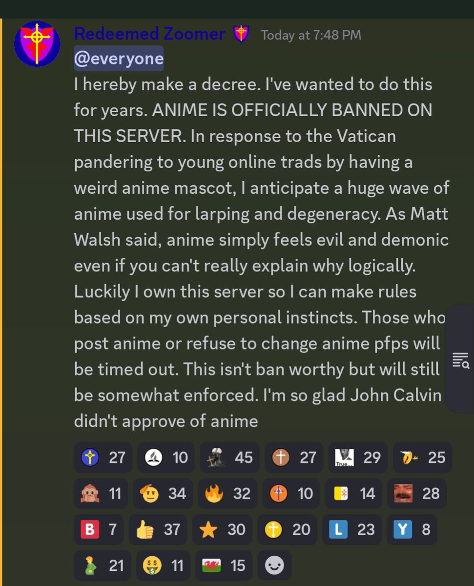 >>18448076Oh, that guy. All I know about him is that he had a melty over Luce and used her as proof that anime was "demonic" (his reasoning literally being "idk why but it just is okay!") and banned anime avis from his Discord.