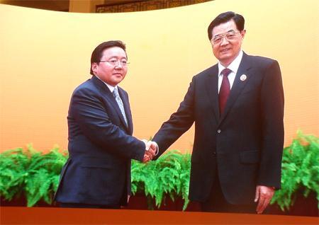 Mongolian President Tsakhia Elbegdori (L) shakes hands with Chinese President Hu Jintao in the Great Hall of the People in Beijing on June 7, 2012.