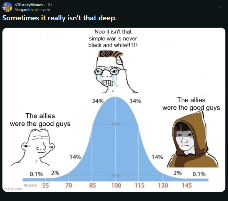 >>18450438Nah this is a genuine brainlet postIt's presenting a false dichotomy, suggesting the idea that either the war is black and white or everyone is somehow equally badBut that doesn't have to be trueYou can acknowledge the grey on each side and still say the allies were way better than the Axis. If you don't include the Soviets, it's even true