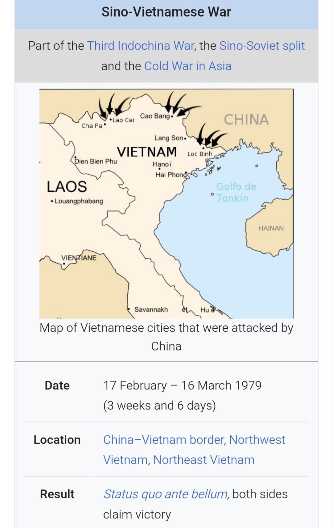 >>18452469>>18453493The point is that the war in Vietnam was launched by the US to contain Communism. The US objective was to maintain a pro-western S. Vietnam. The N. Vietnam objective was to unite the country under a single, independent government. What the US didn't understand was that the Vietnamese cared more about nationalism than socialism, as evidenced by their break with China in the Sino-Vietnamese War. The US failed in its short term objective, but the worst fears of US planners never came to pass.
