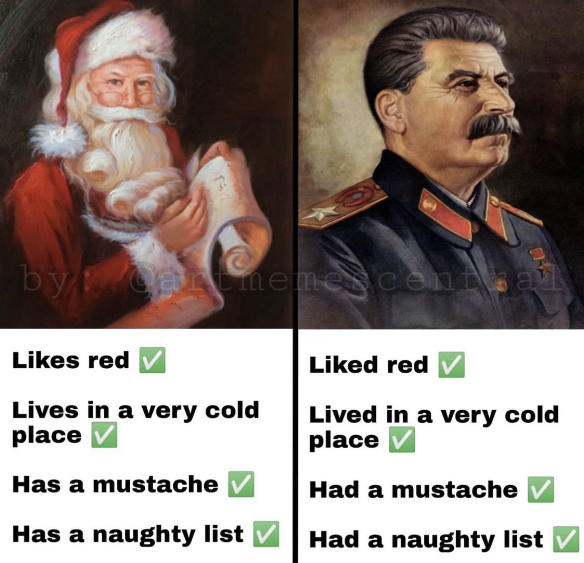 >>5023919Fake news. Old St. Nick was red from the start, per his namesake, even if he lost the bishop getup. He's also based on Father Christmas, who has a little more variation in color and can be found in blue, but even he is traditionally red.That's not to say there's anything wrong with a blue Santa, of course. Some of my best friends are blue.
