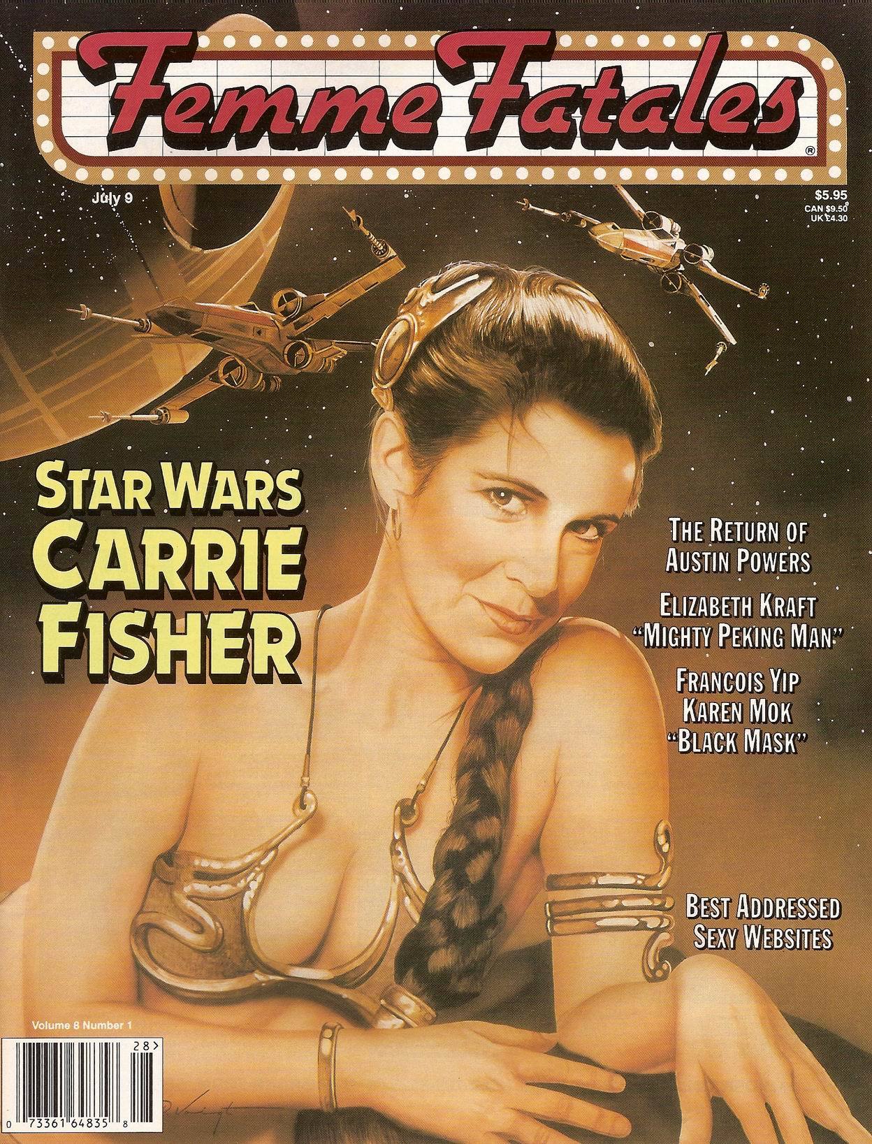 Here's a bit of pop culture curiosity: Carrie's cover shot from Femme Fatales magazine in 1999. Weird choice for a title as the magazine had nothing to do with film noir and everything to do with movie babes fan service. There's 12 more images for the article itself, will post if anyone's interested (probably just serious Carrie collectors, who might very well already have them since these aren't my original scans - I found them somewhere years ago).