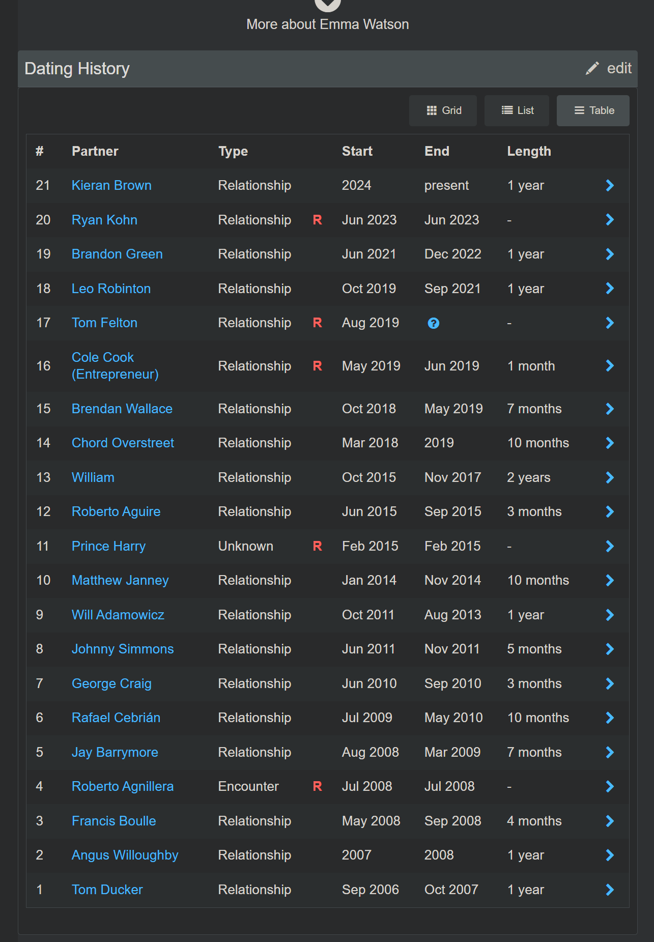 >>5135152When you get into actual dates, it gets real messy. You'll find that a lot of them blend into each other, sometimes for 2 months or more. According to this, she was "dating" 4 guys at the same overlapping time in 2008.I don't know if you would call it "cheating" to be dating someone else while still in a "dating?" relationship with someone for an extended time, but if you do that happened as recently as 2021.This might answer how it's possible for a brilliant, beautiful, wealthy, thoughtful woman to somehow remain single. And before you blame the other party, keep in mind this has happened 15-20 times. I honestly don't blame her. She has the ability to choose and control any male she meets at any moment, anywhere, for any reason. Why give up such a power willingly?