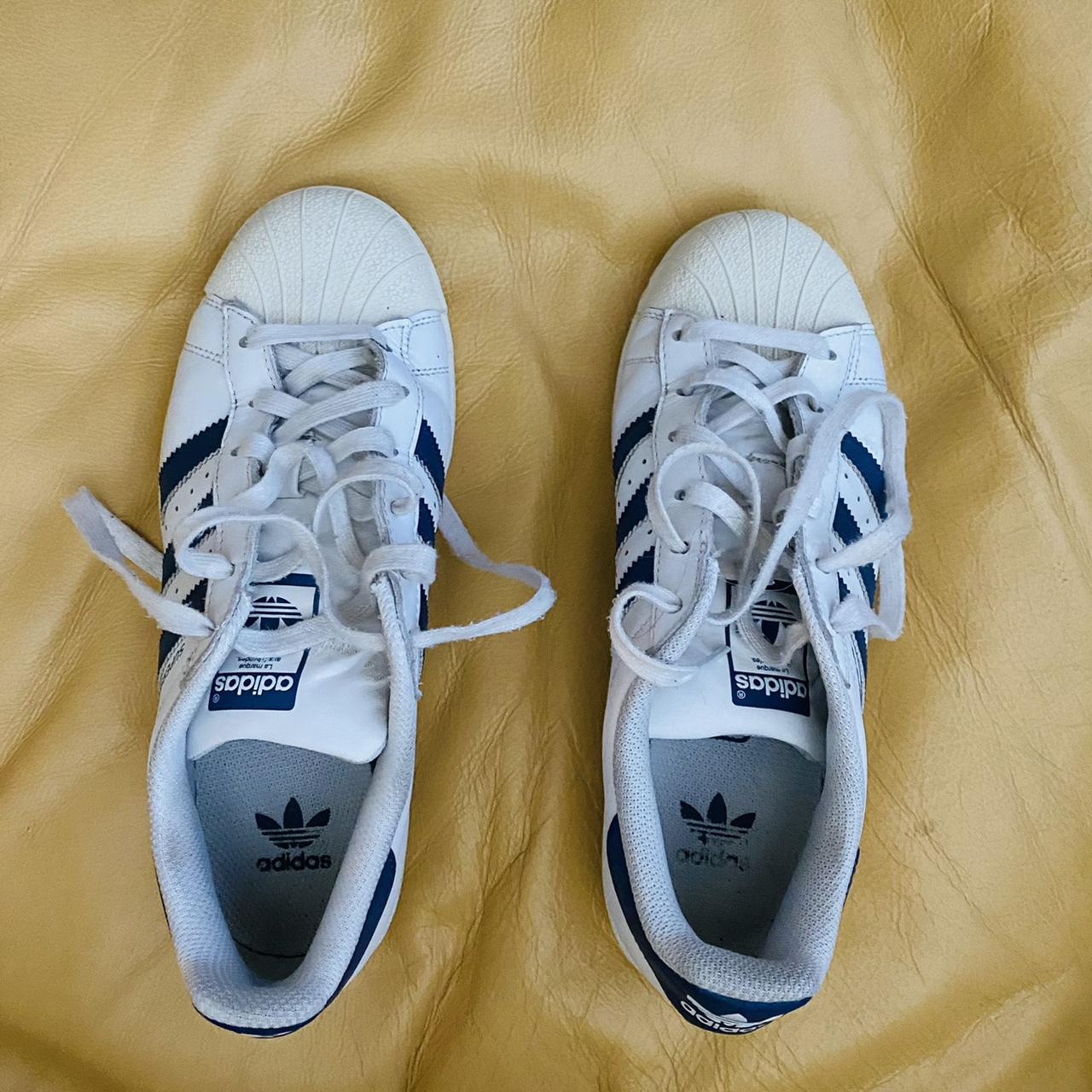 >unisex adidas superstars with blue stripes. loved the shit out of these things. so comfortable too. even wore them to disney world too for those 28k steps days, so you know these puppies can handle a lot. these shoes have been with me through thick and thin, like no one i know.