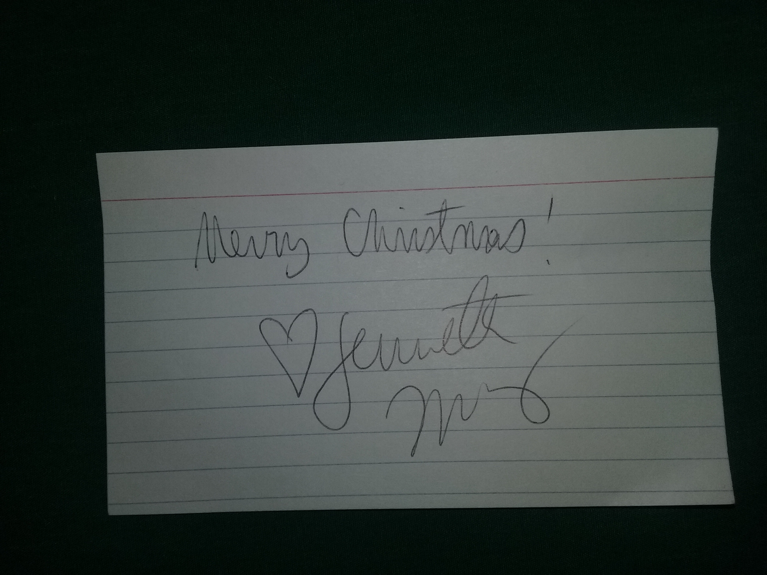 And finally, a cute little handwritten note that was included in the package. I'm sure he had a VERY merry Christmas smelling the sweat whorish stink of your slutty feet, Jennette!
