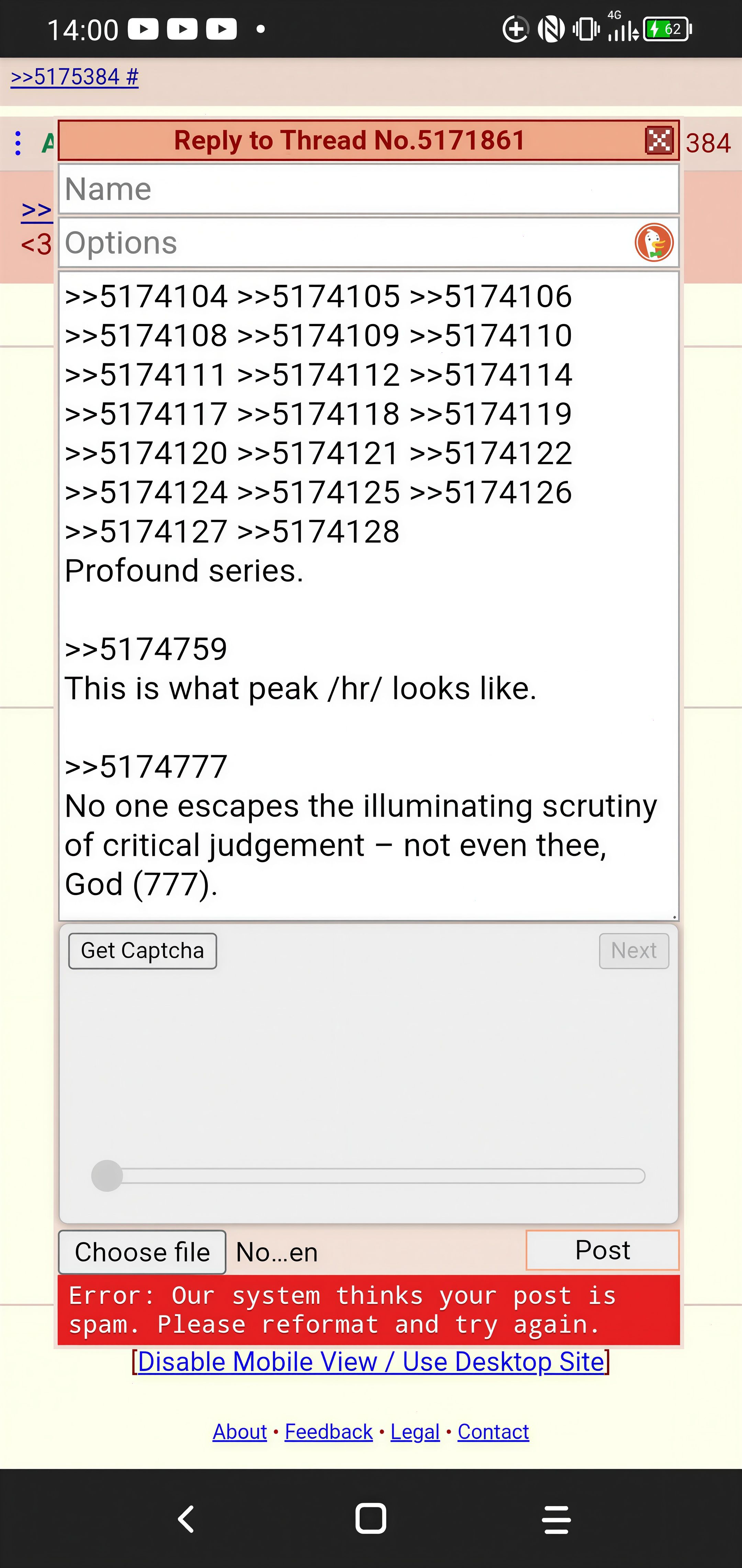 >>5174104>Error: Our system thinks your post is spam. Please reformat and try again.¯\_(ツ)_/¯>>5174759This is what peak /hr/ looks like.>>5174777No one escapes the illuminating scrutiny of critical judgement… not even thee, God (777).