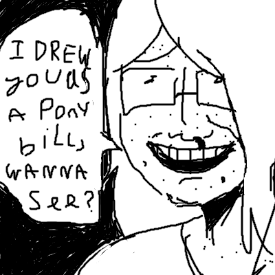 my disgusting attempt. im sorry. rorys wouldn't be like this, hers would draw more inspiration from fluffy pony abuse rather than the original source material. i think his cutiemark would be fire, getting it during his first serious argument with the club, an uncontained one as his talent is just being a useless destructive force, while a pony with a lighter or campfire mark would actually be good for something. he has super weak magic, being able to spark at joshes eye if he gets lucky, but often just burns himself. he was able to set the store on fire with one of his little sparks due to how flammable comic books are. im really shit at recreating the style sorry. i wont ever draw josh but im amused by the idea of him being a Pegasus thats too fat to fly. also, i guess alana and rory could get along, if alana is noseblind..