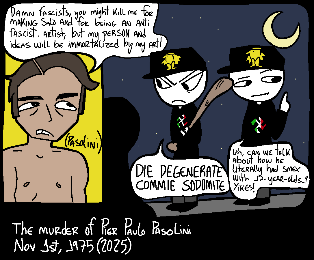 >whining about an issue that no one cares about except me .pngI hate how normies shit on Pasolini's memory because he was a "diddy ahh blud" when he was the best and most interesting artist EVER. Rest in piece, my saint. (BTW: I'm aware that the Italian fascists did not represent themselves with a swastika. I am just using a swastika in my doodle because it's the most recognizable fascist symbol)