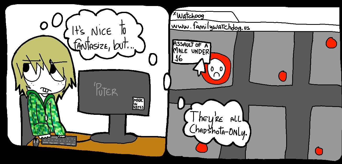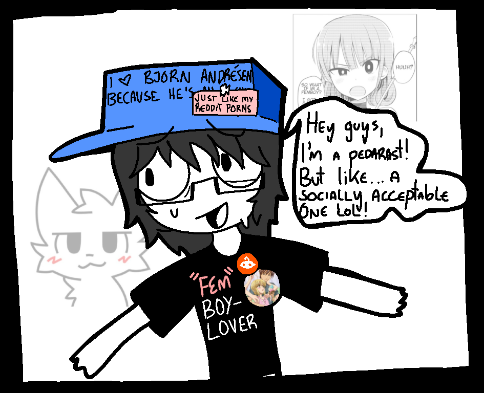 Blackpilled Catamite. Two panels instead of one... but who gives a flip?Buckteeth is a shota while pedo-kun from some drawings above is an adult. I don't know how to differentiate age properly because I'm a shitty artist but they're supposed to be different.
