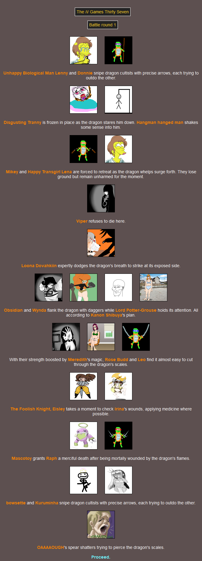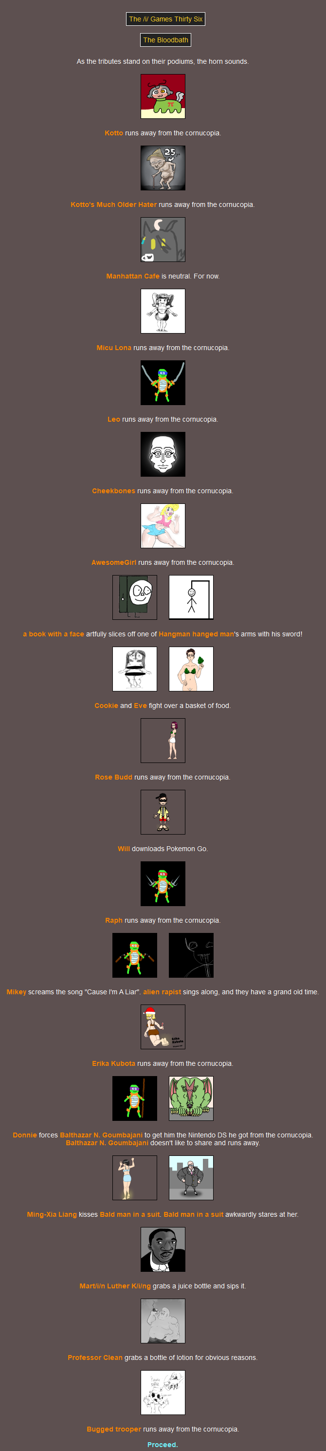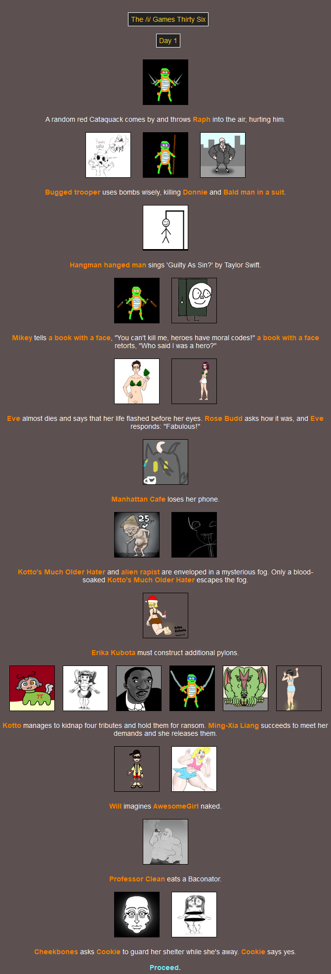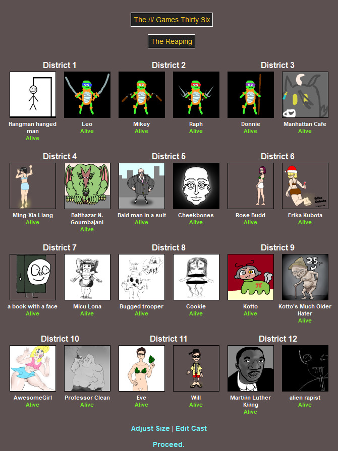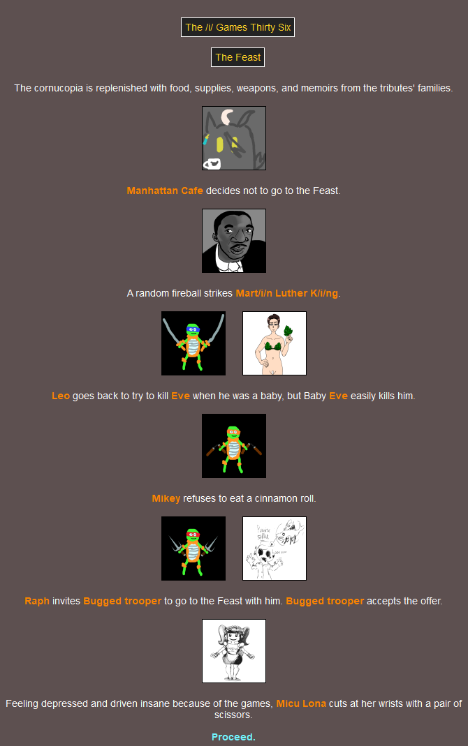 F the 16(!) fallen.Since nobody voted to see the peace slides we're moving right along to the Feast! I suppose you could say it's out of the fire, and into the frying pan - but not for one of you. Had a good chuckle when I saw that one.MC was the only one who didn't go. You can lead a horse to water, but it turns out you can't lure one to the Feast.You'd have to back a LONG way to encounter her as a baby! Hope the trip was worth it.Damn Mikey why'd you even go if you're not gonna eat anything? At least Raph's showing some camaraderie.I thought that last event was fatal but it isn't. She must be going across the street and not down the road.>>818125I ruminated on this while I was in bed and I came up with a solution that I'm sure has no chance of backfiringIf a latecomer wants to swap in for a tribute that is explicitly swappable then they can do so, as long as they link to that tribute as well as the entry post, and mention that they're swapping in and not just giving them a (You). This feels like it could work out>>818176Perhaps the RNG gods took offence to you taking all those hostages back there lol
