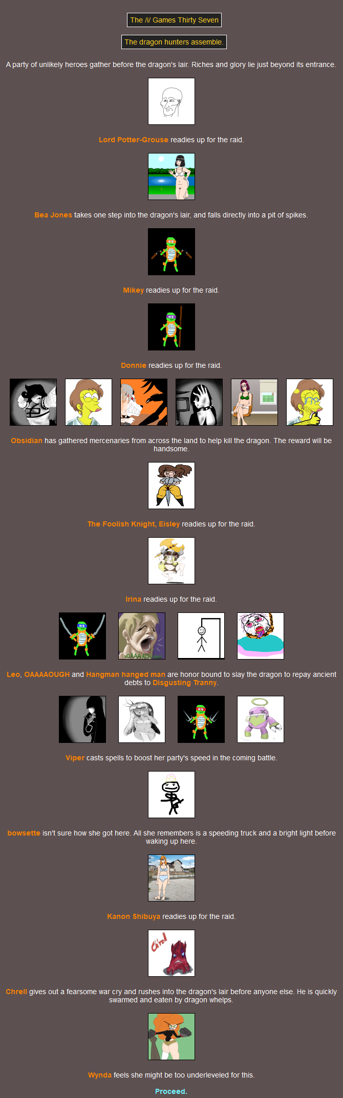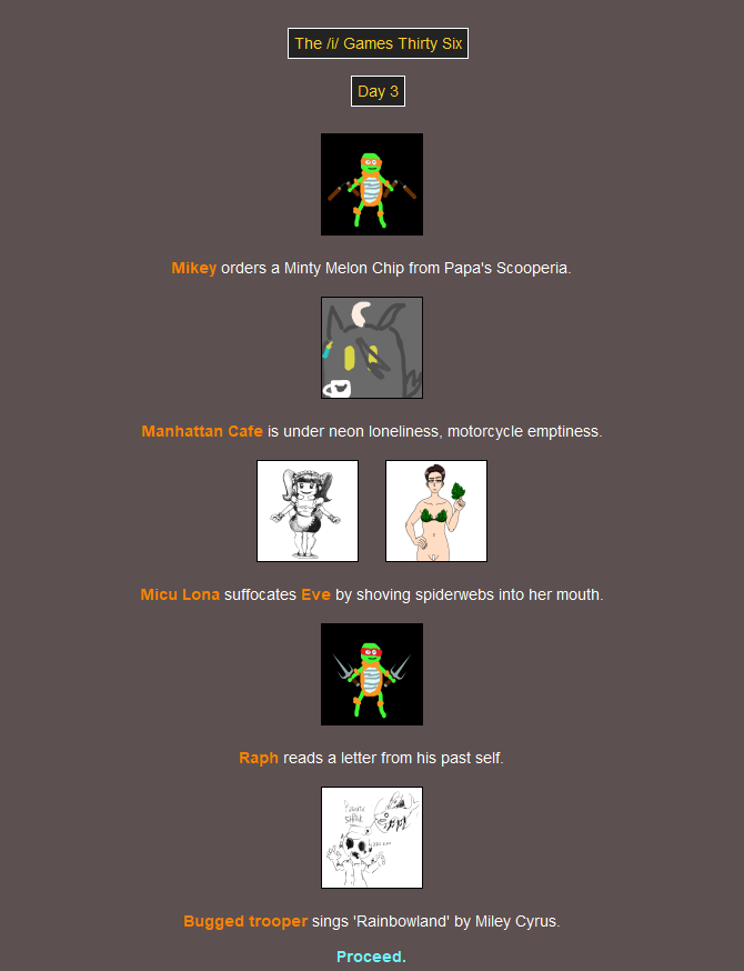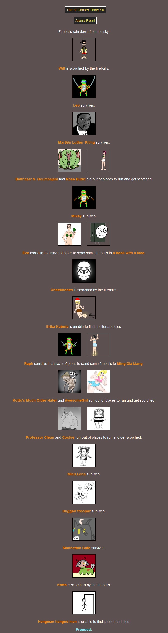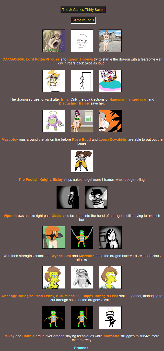F the 16(!) fallen.Since nobody voted to see the peace slides we're moving right along to the Feast! I suppose you could say it's out of the fire, and into the frying pan - but not for one of you. Had a good chuckle when I saw that one.MC was the only one who didn't go. You can lead a horse to water, but it turns out you can't lure one to the Feast.You'd have to back a LONG way to encounter her as a baby! Hope the trip was worth it.Damn Mikey why'd you even go if you're not gonna eat anything? At least Raph's showing some camaraderie.I thought that last event was fatal but it isn't. She must be going across the street and not down the road.>>818125I ruminated on this while I was in bed and I came up with a solution that I'm sure has no chance of backfiringIf a latecomer wants to swap in for a tribute that is explicitly swappable then they can do so, as long as they link to that tribute as well as the entry post, and mention that they're swapping in and not just giving them a (You). This feels like it could work out>>818176Perhaps the RNG gods took offence to you taking all those hostages back there lol