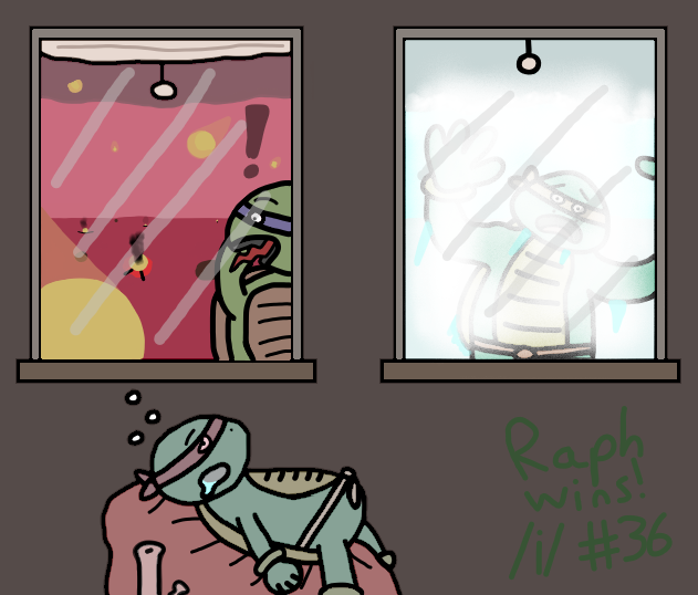 >>817933I was late, forgot to @ the post and my entry was half-assed from time constraints.Voting for Raphael as he was always my favorite turtle! :3>T20NY