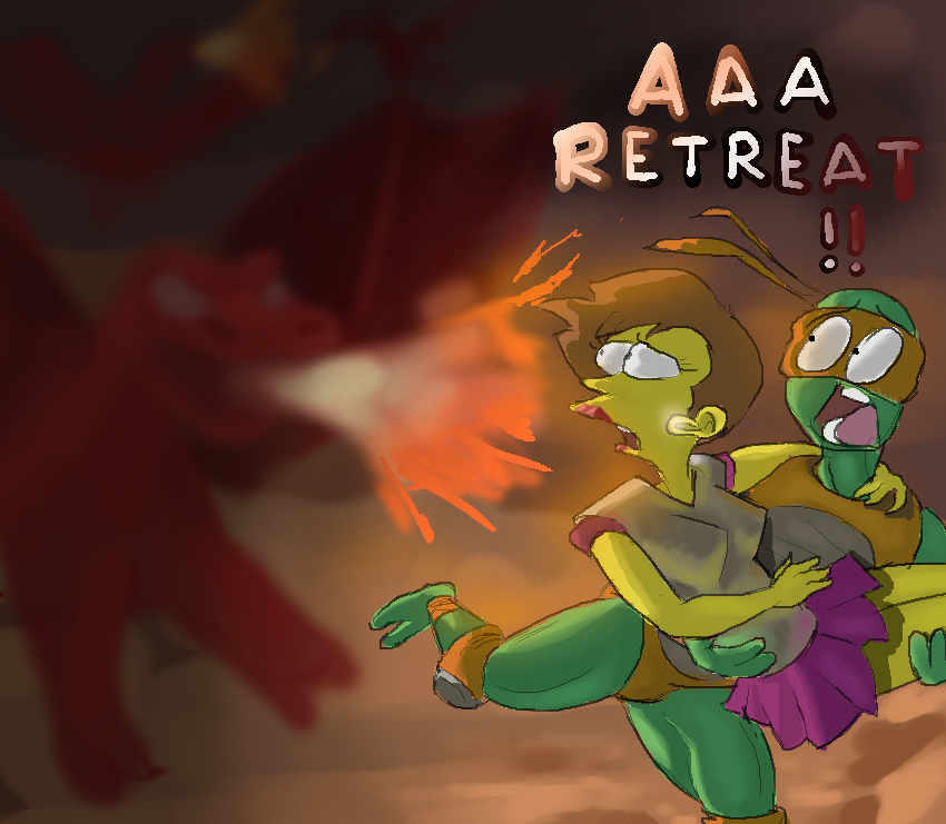 The skirmish begins! Strike with all your might!>https://www.youtube.com/watch?v=tHw1kPFIa-0Lenny, Lena, and the turtles have found themselves in the company of the minions of the dragon - fanatical cultists who worship the great beast, as well as the tiny spawn of the dragon itself! Expect these two groups to show up a lot in the coming events, they won't let you just waltz off with all that treasure...The hanged man finds himself in the company of someone with a similar neck accessory! That's some good noose!Who knew a (hell)hound would be good at (dodge)rolling over?ngl Obsidian and Wynda make quite the intimidating pair of damage-dealers. Meredith's using her magic to its fullest potential too. Only Viper seems to be hanging back for the time being, calculating her next move...or maybe she's just brooding in the dank of the cave.Maybe Eisley should've been a cleric instead, if that is indeed ye olde equivalent of a field medic.Lightning doesn't strike twice for Raph. The dragon only needed to strike once.If you pin one of the cultists to the wall by his head you get to take home a stuffed dragon plushie from the prize counter.There goes your weapon. And that was only your first action, too! Maybe you can still be useful without it.