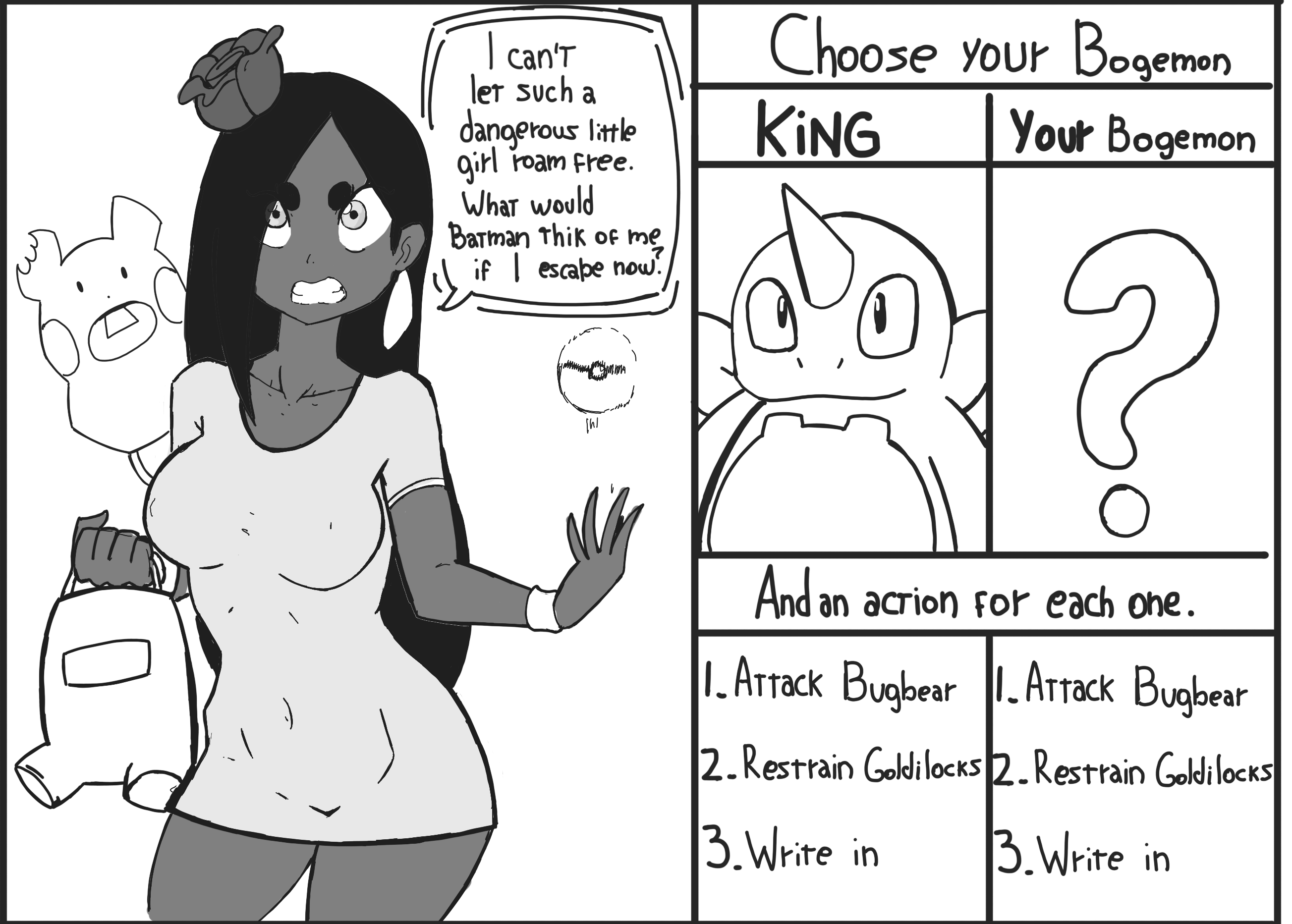 It's either full fakemon and we come up with an original idea or we pick a franchise to defile. I'll think it over. My clearer idea is a quest about a perverted Churlibear from Medabots but we can't have that.