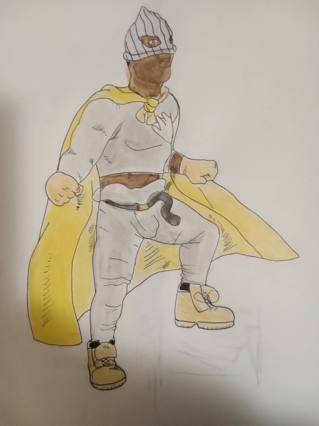 here is "blackman" it's an OC. I just came up with the idea, "how come there is no such character called "blackman" and then I just thought literally, he's just a black guy who is a superhero. The motif on his chest are like gang signs. He's wearing like longjohns in some drawings, he dick shows through his pants and he likes wearing timberlands. I just thought it was hilarious because there's no such thing as a blackman superhero. I overexaggerated his body here because that's almost how I feel looking at comic book art sometimes, but it was mostly to experiment with comic book style shading because I'm not really good at that.