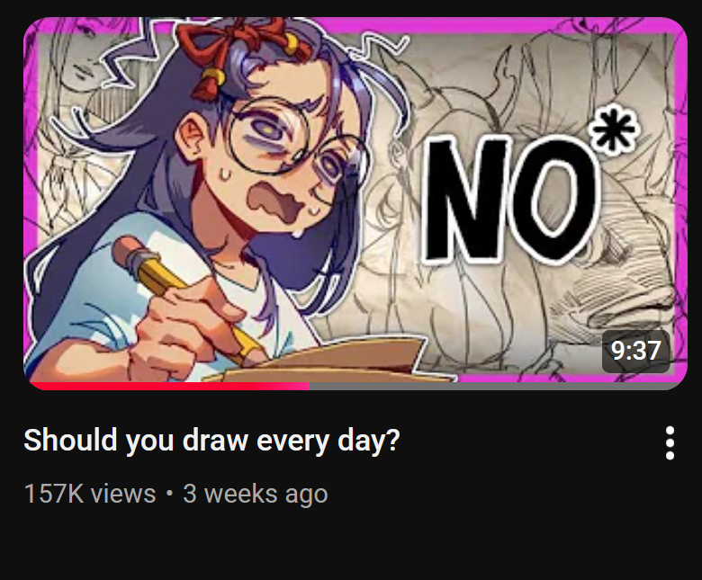 >>7777237I'd say it depends on the person and how they learn ultimately it depends precisely on the definition of drawing everyday one subscribes too. If you mean draw one complete image everyday regardless of how shit it is yeah that could work for someone, other people might get more caught up on what exactly to draw and it might turn them off because of lack of ideas. some people benefit from doing draw a box type shit or drawing 40,000 circles a year. some people are hopeless and give up before even trying because they aren't perfect draw gods instantly.>>7777423>>"if you are bad at drawing something, you can just not draw it" if that's true then yeah that's fucking shit advice. the things one is weak at are the things you gotta do the most despite it not being pleasant or easy. It's like telling an aspiring bodybuilder to not worry about striving towards good body symmetry.