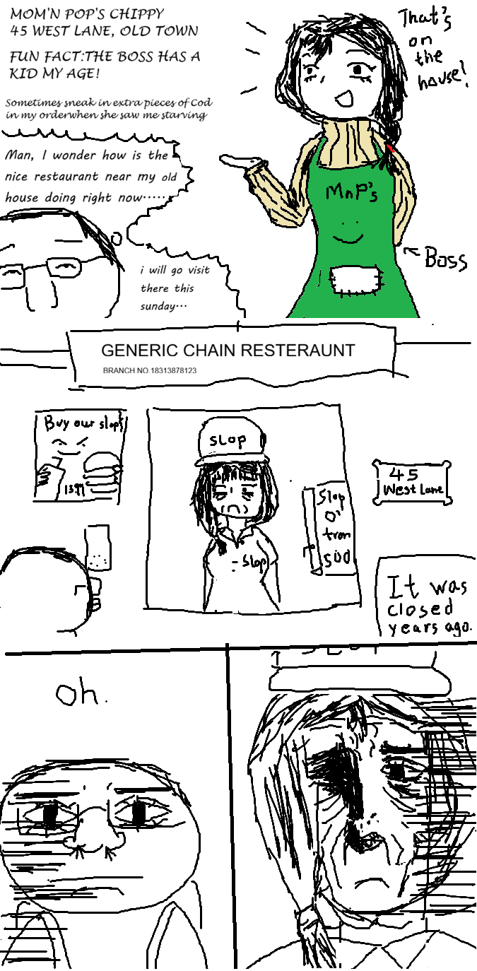 >>7907905only use text for important stuff that can't be expressed visually. why not draw her generosity instead of explaining it? perhaps find a way of visually connecting the location instead writing "i will visit there" and "it was closed years ago".