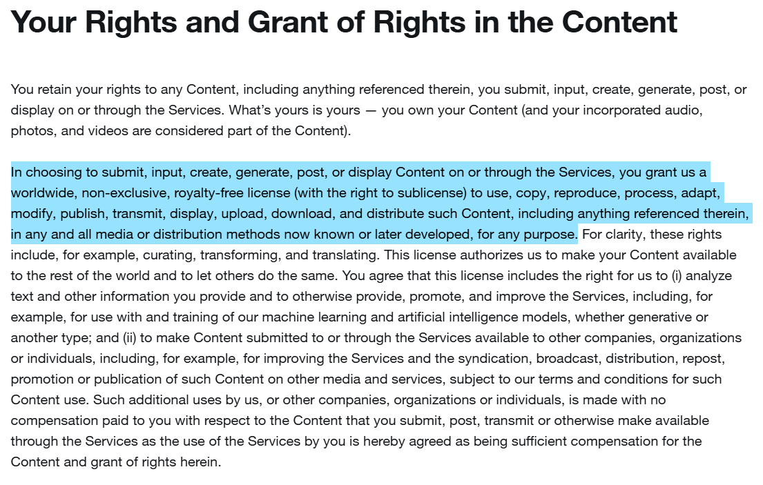 You don't post your art on X, right? Well, anything you posted isn't actually yours anymore. It belongs to Elon Musk now. He can straight up sell your work and you don't get anything :)))https://x.com/en/tos
