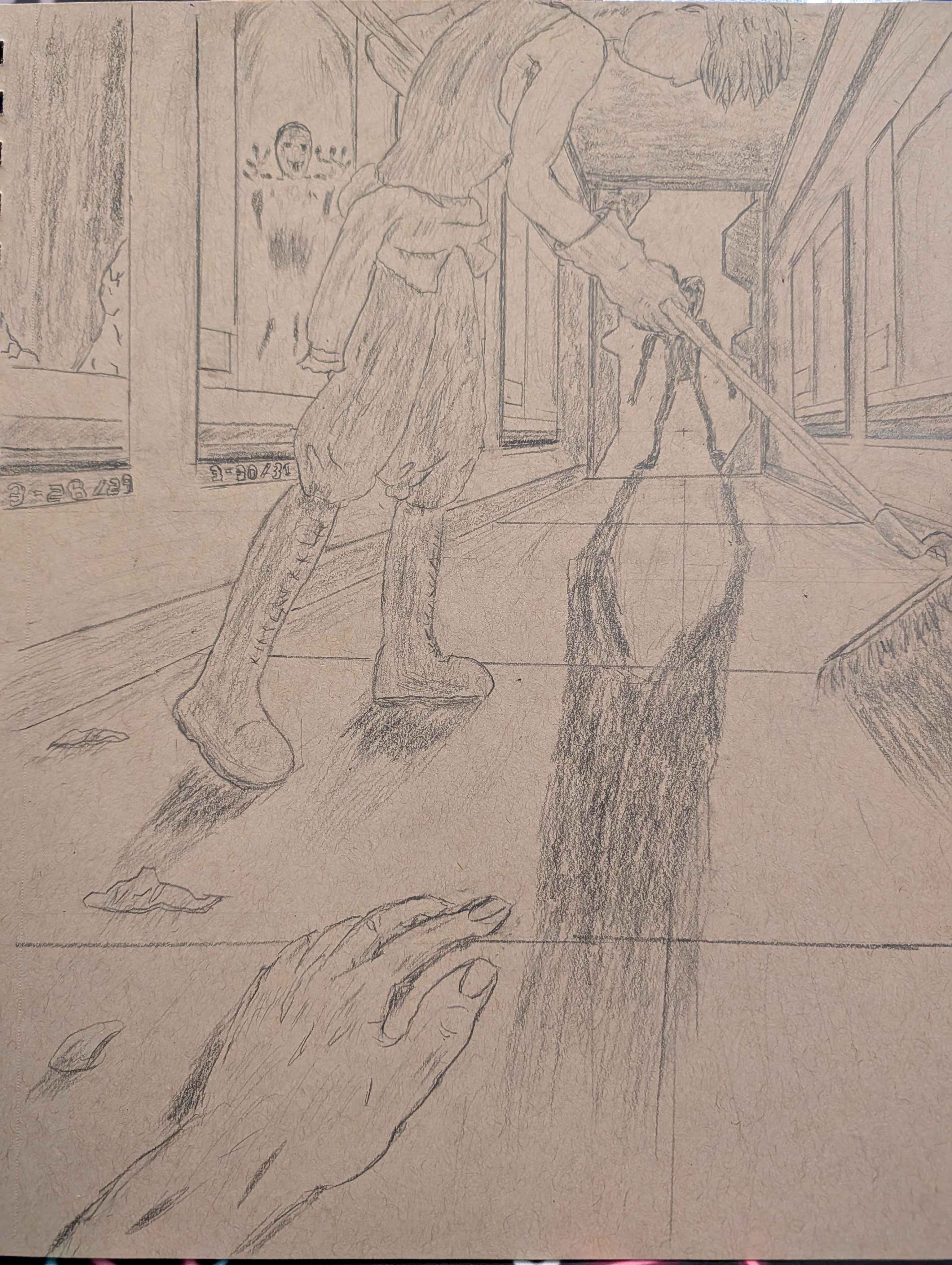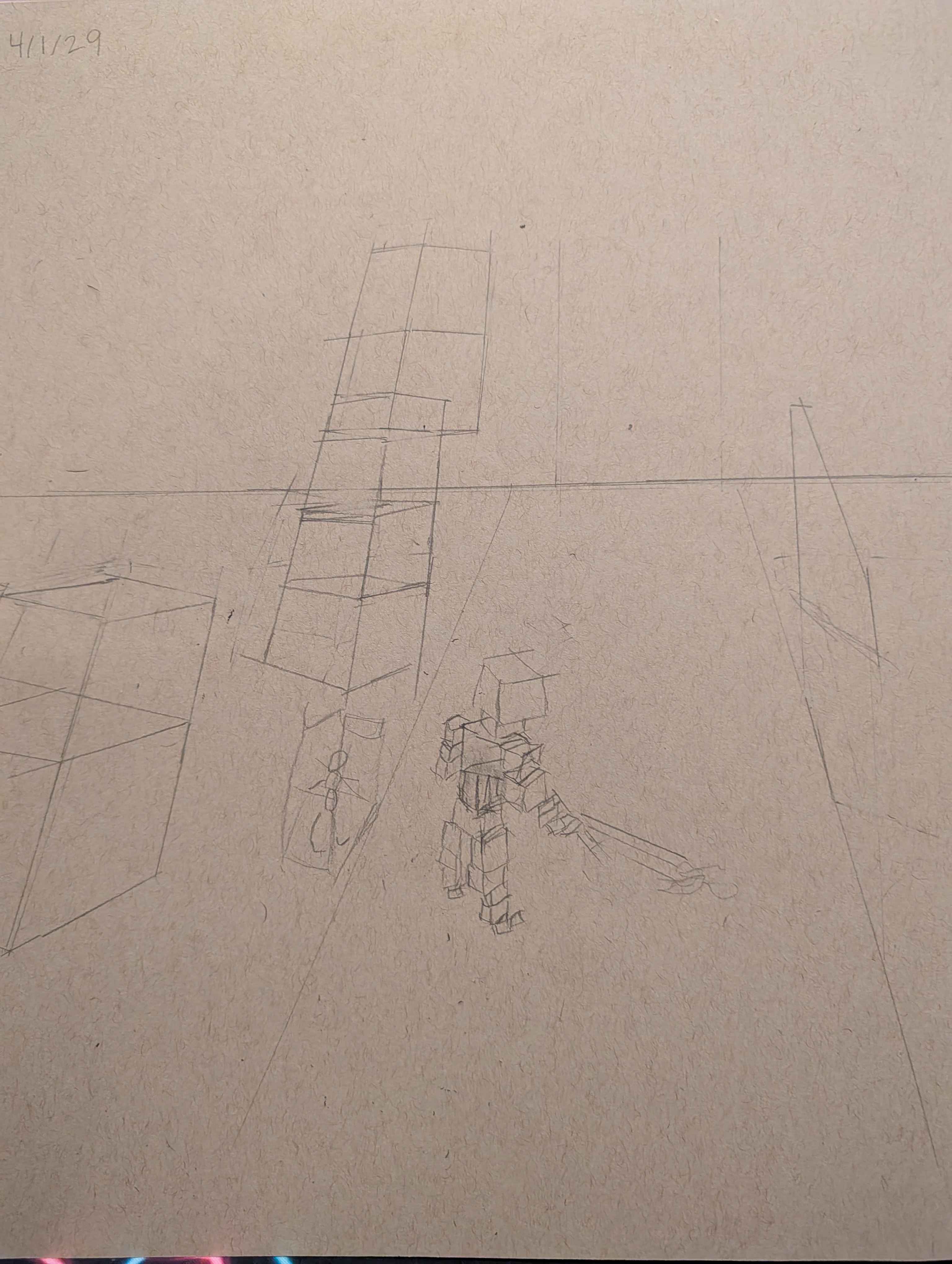 Real sloppy but I wanted to fuck with the scene a little trying to draw it geometrically and see how ratios changed things. >>7909872Glad you like it! It was fun how the ideas played out>gonna draw a farmer>shit I didn't start low enough, cropped his head>made him look away on accident>accepted a challenge to draw scifi, guess he's a janitor now>wait, I can do a horror thingI just wanted to rush and finish it, but initial idea I would've rolled with if I had the patience was some beautiful but scary figure standing at the end of the hall. I'll likely draw it later on.>>7909890That's one I liked to do quite a bit but I knew fuck all about trees, also on my list to redraw sometime.