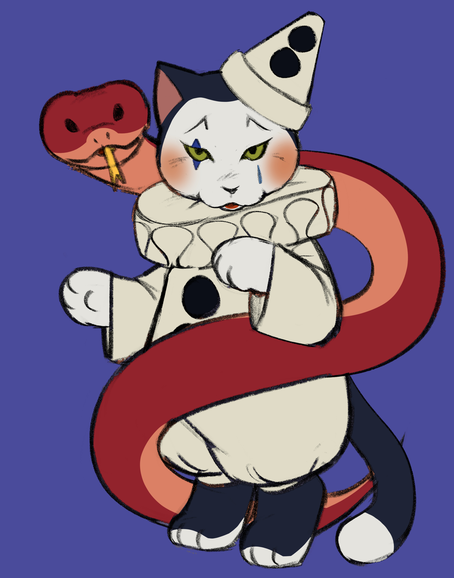 I drew this pierrot cat a few months ago and never really did anything with the sketch, so I plan on making this a painting or something >>7769427I only have my pronouns listed because I get annoyed when I'm asked the same question over and over again. I'd rather just list them so people don't have to ask>>7770569I like this guy, he's such a silly fellow