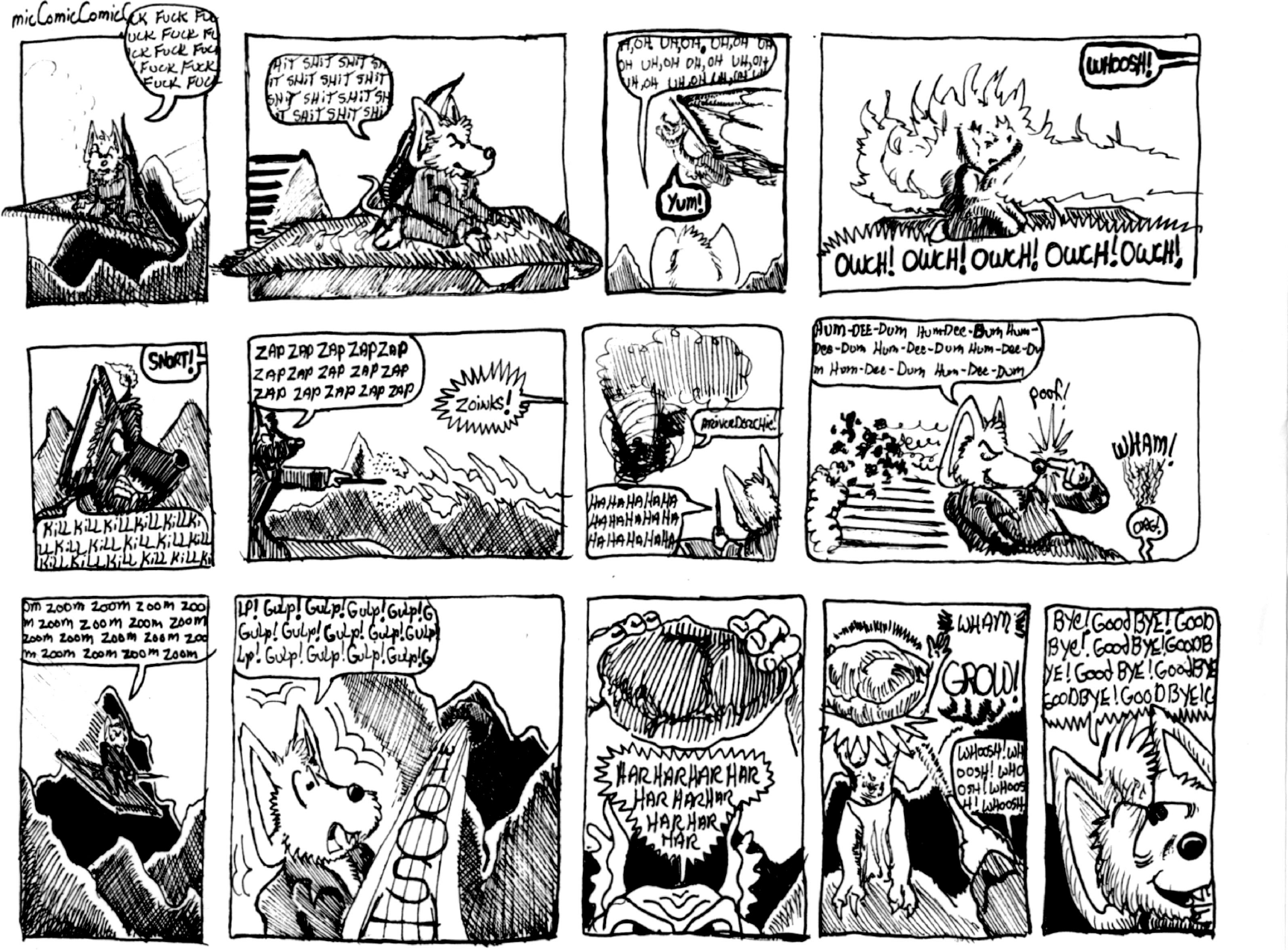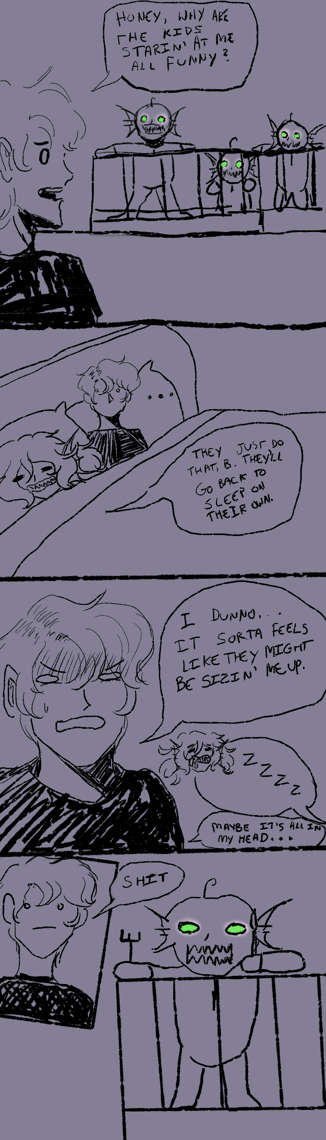 >>7841942I had a webcomic once upon a time. This sample strip wasn't what I intended, but what I had time to do, a story that grew organically under my pen as I spent time in waiting rooms with too much time on my hands. It went away several years ago, but the dream still clings, still haunts, still flickers as a dim hope.