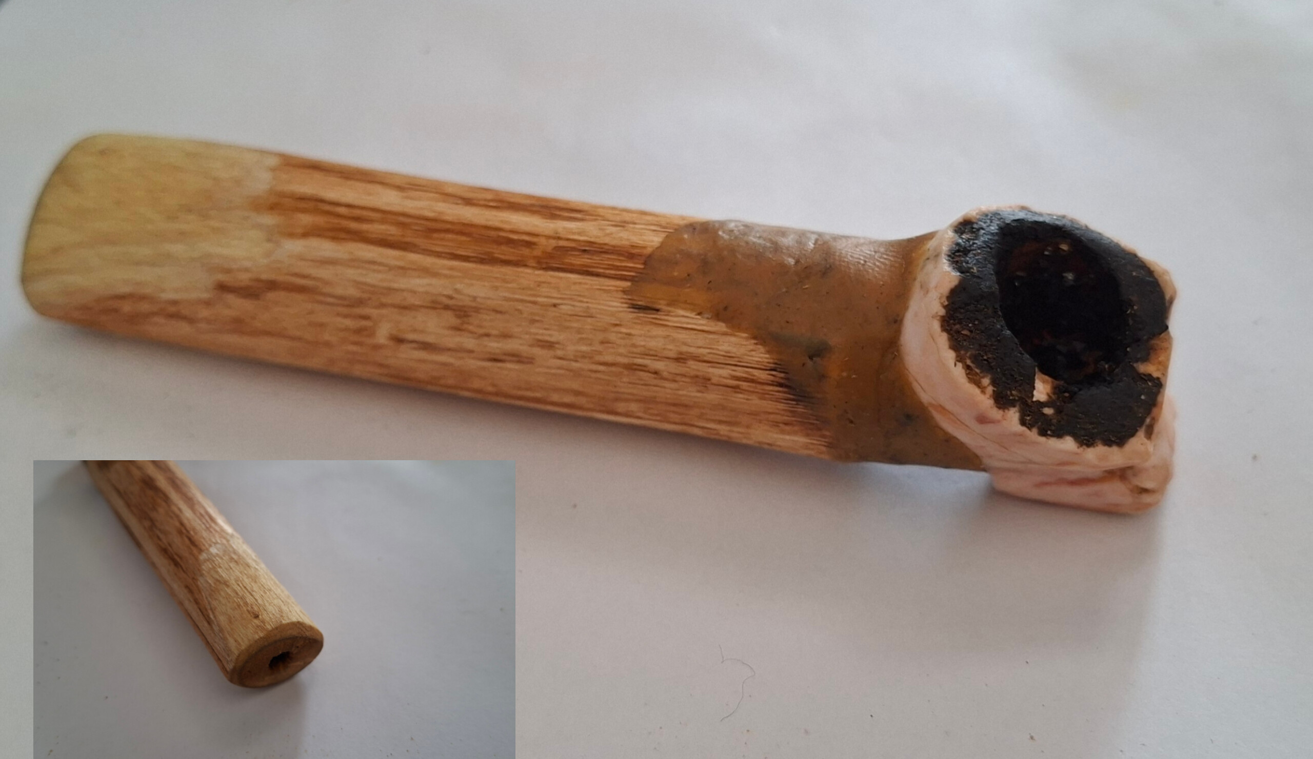>>7883857its like the pink one on the picture but it broke, it had enough of a stub to be able to fit into a 1/2 inch hole in the wood, I drilled a smaller hole on the otherside, carved down the mouth part a bit, and sealed the union of the stone and wood with pitchits a pretty artsy pipe, if its find on a burial in 10000 years its going to end up in a museum