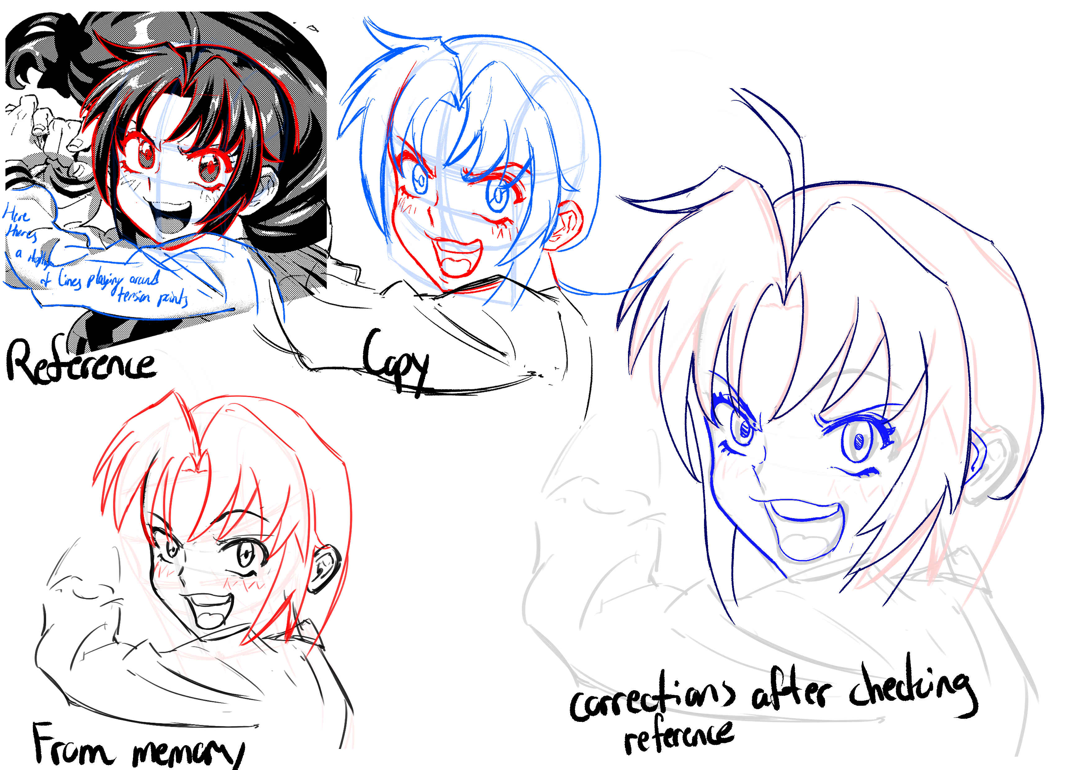 Think I've done a similar style of study once or twice before but this is the first one since finding this general. It's not exact but it really helped me to be more comfortable with adjusting things on the go instead of getting frustrated as soon as something feels off. I feel like I have a better grasp of generally where to put the parts of the face. I feel like I understand how to draw open mouths a bit more. Still struggle with the placement and size of the ear.Hair is still tough. I struggle with the curved lines. I feel like it's because I tend to draw with my wrist since I was drawing on a very small drawing tablet, but even after switching to a bigger one I still can't really draw from my elbow that well.I did think it was a helpful exercise but please tell me there's a more casual shorter way of doing this. Am I just taking too much time by being obsessive over the copying? or did I just fuck up by doing this in one sitting.