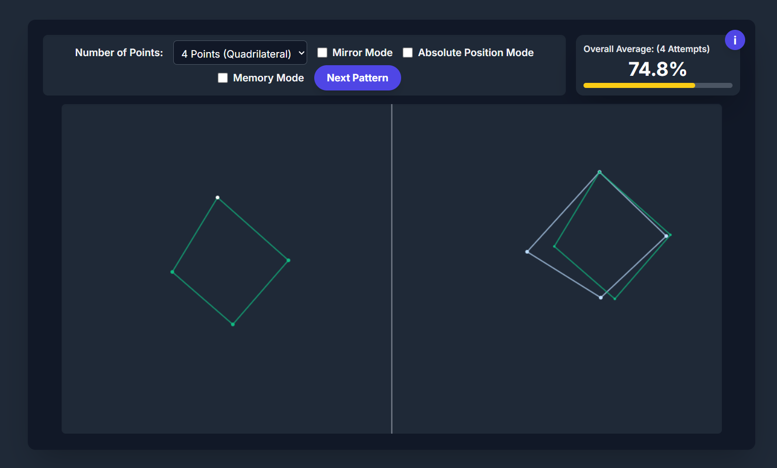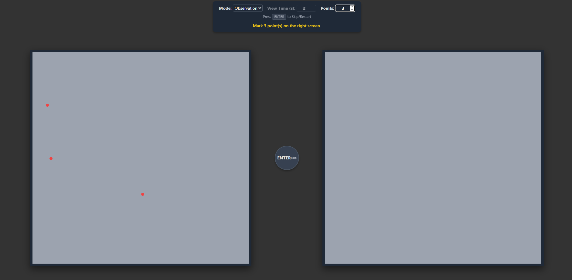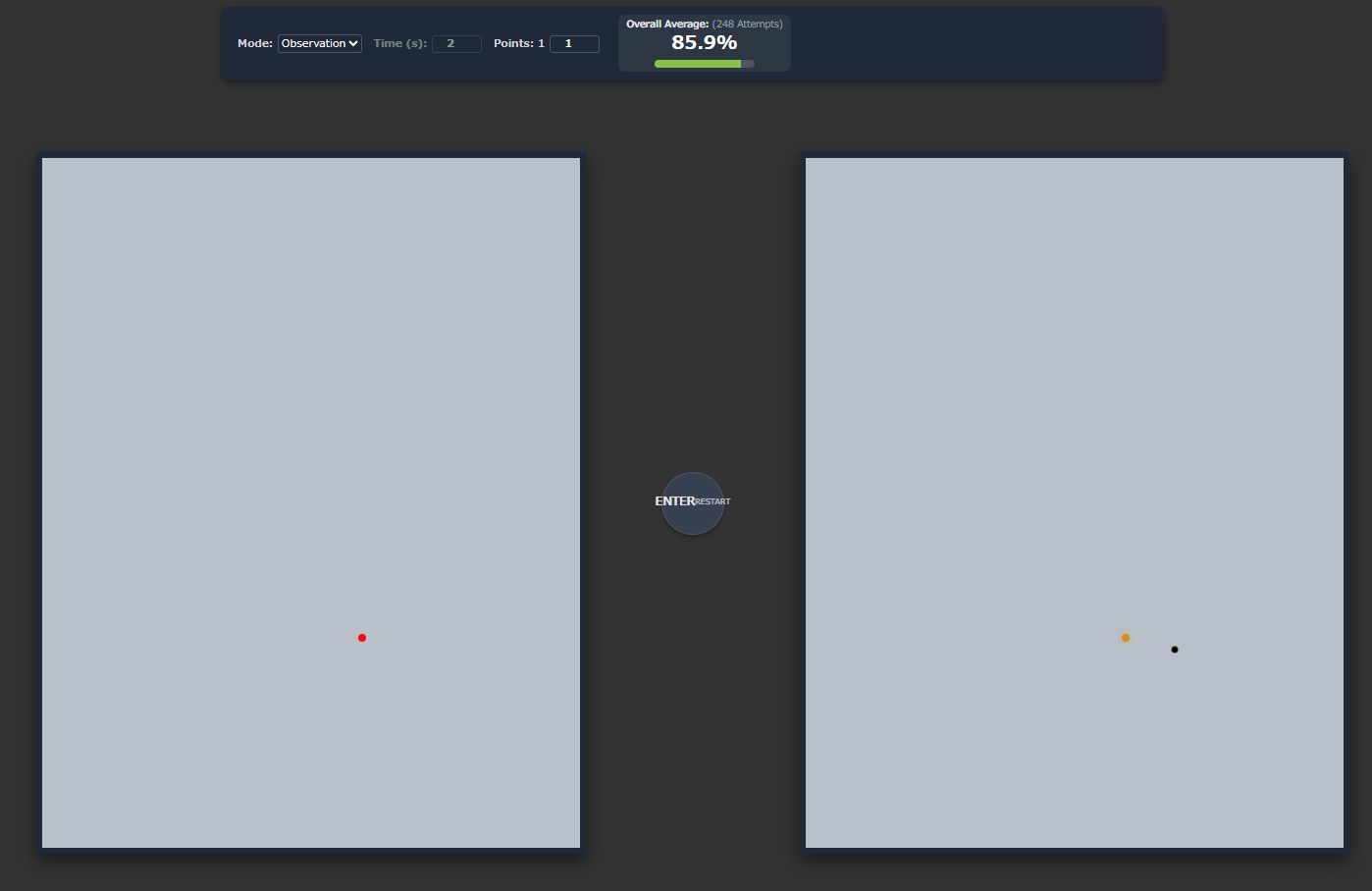>DeliberateAccuracy 3.0 Final>Observation ModeTargets remain on the left screen while you click their locations on the right. This trains direct accuracy and hand-eye coordination.>Memory Mode(IMPROVED)Targets disappear after a set time. You must recall and click their positions from memory, training spatial short-term recall.>Overall AverageThis metric calculates your mean placement accuracy across all attempts completed in the active training mode. It resets when the mode changes.https://files.catbox.moe/2kf64e.html>>7804165add