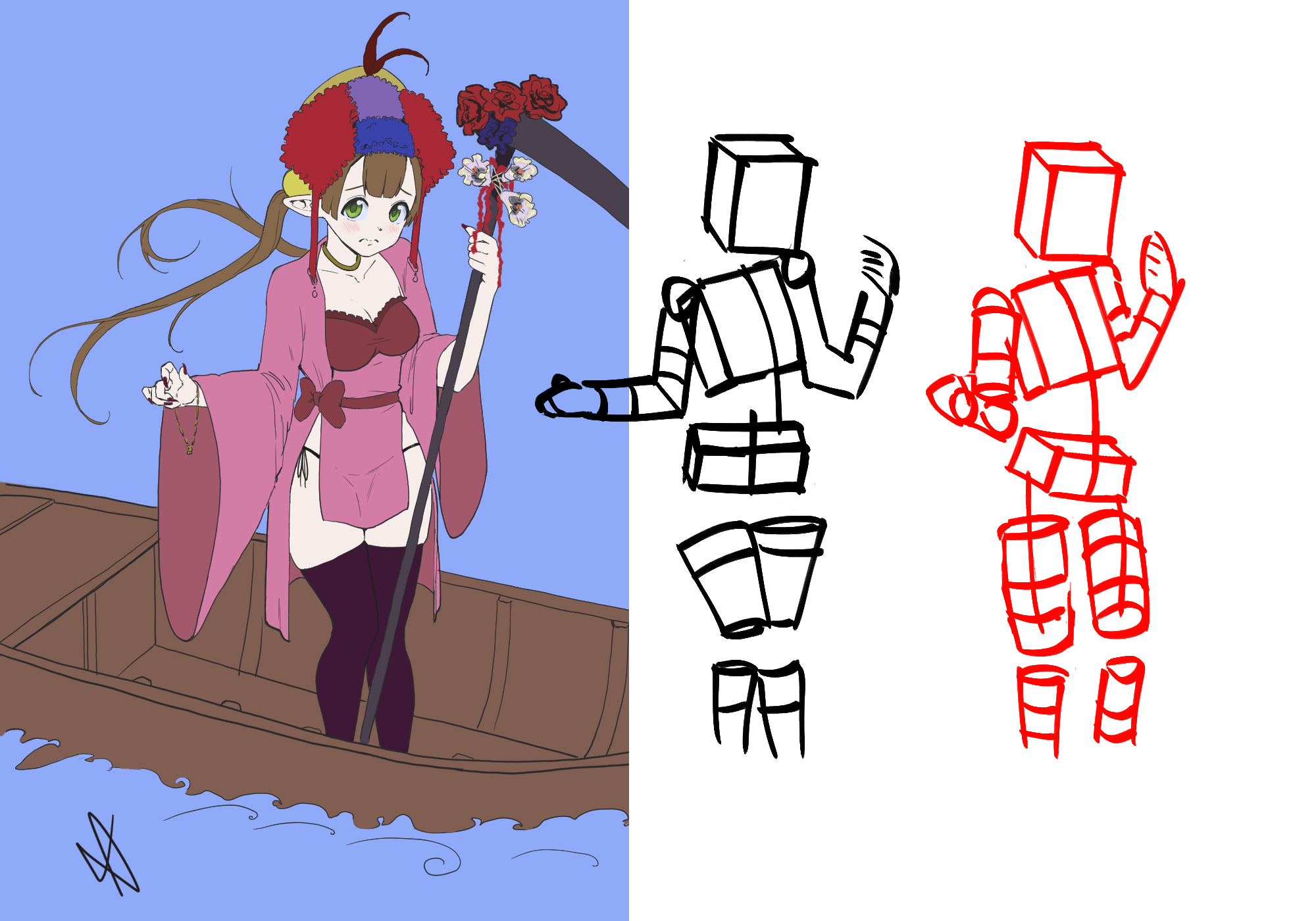 >>7809368Nice job on the face, she's cute.>Can you please help me and notice some of my decision that influence the appeal of my illustration? To get the minor things out of the way, I think the upper part of the background could use a little more of some kind of detail, just so it's not an empty void of color. Also, I can't tell what the red things dangling from the white flowers are supposed to be.Now on to the actual problems I see.I will just warn you now that I am only beginning to learn the things I am trying to correct in your drawing, so take it with skepticism.First, the forearm is a little too long. It's a common error when trying to do foreshortening that things get drawn to the side rather than forward. I also think that arm's position is a little awkward given her torso posiiton.Second is the angle and perspective of the pelvis in relation to the ribcage. Her weight is settled mostly on one leg, so that hip should be higher than the other and turned more to the side.I deconstructed your drawing (in black) and reconstructed it in a way I think is more correct (in red). Notice how the centerline of the body lines up better, and how the angle of the hips and ribcage oppose each other. Also, I switched which leg she has her weight on to keep the upper body pose similar.It's not a very good redline, but hopefully it's enough to help you see some unnatural spots.