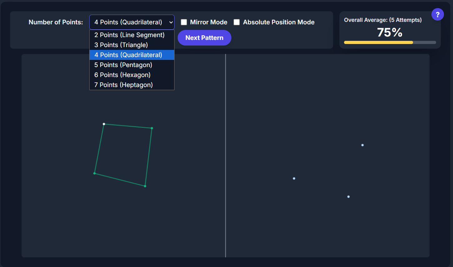 >>7802364DeliberateAccuracy 2.1I add a new modeObservation: See and copy the point's position immediately.Memory: Memorize the point, then copy the position after it disappears.https://files.catbox.moe/ezka00.html