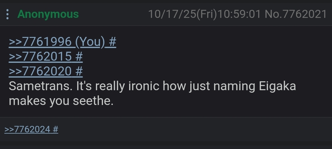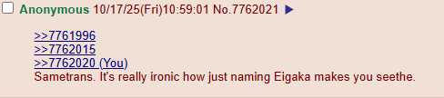 >>7761996>>7762015>>7762020Sametrans. It's really ironic how just naming Eigaka makes you seethe.