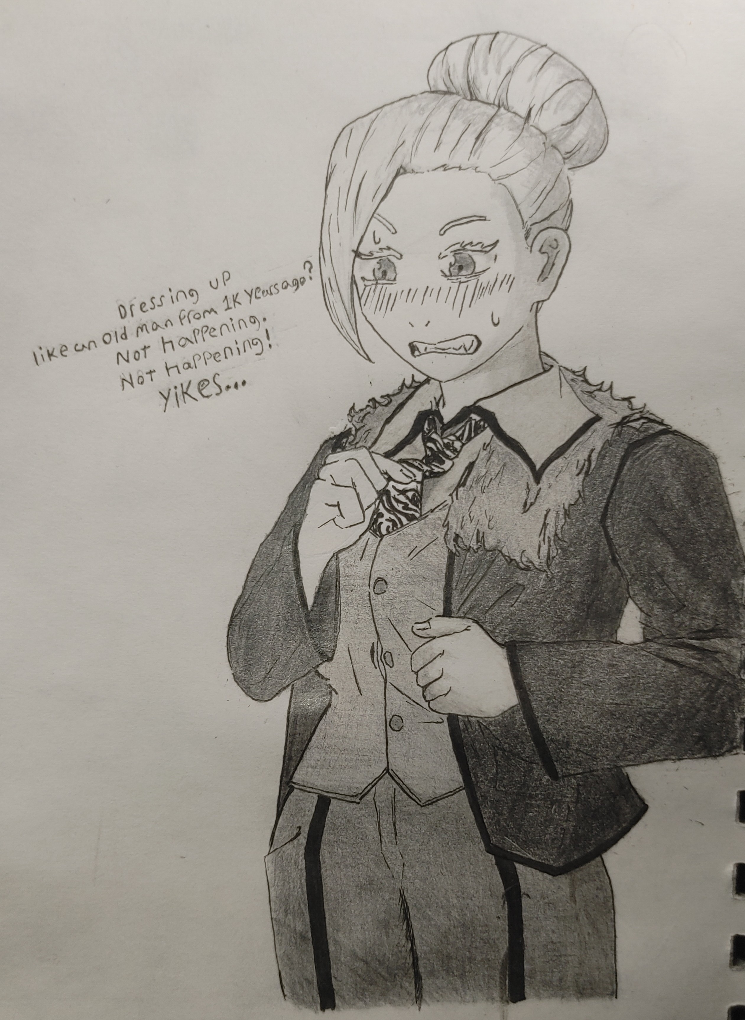>>7777201My dumbass ran out of space when penning the letters even though I penciled them in first for that exact reason. I was considering just editing out the text for this post but couldn't be assed. Should probably redo the dialogue on digital>>7777222Thanks, it looks so much better with that small edit. I should make the switch to digital soon since I notice the proportional mistakes while drawing 90% of the time but just can't be bothered to erase and redo it