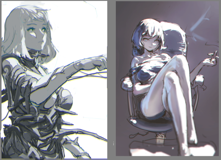 >>7777607I prefer the right except for the face since the dark lines maker her look less delicate.You could also try something like this, darker lines in the shadow, lighter lines in the light.