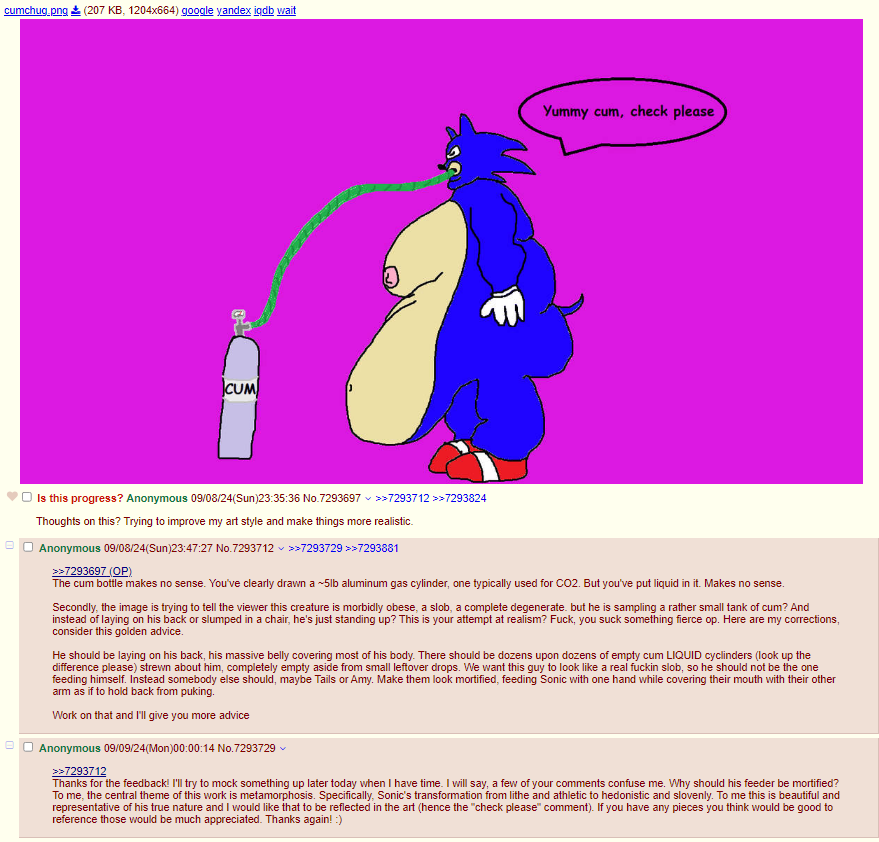 OP is somewhat right.Most porn consumers dont really give a single shit about the artist, only the work, and most of the time its for reasons only someone who lurked the abyss can fathom.Most porn artist dont even know how their work is used.Most just save it in their foldersA lot just repost it to get attention or ERP on porn sites/r34/discordSome make cringey fanfiction of itA lot just want to write even more cringey comments on itNow you also have the whole AI training thing.Lots of other porn artists just trace over it and if you're actually someone who pays attention you know how incredibly fucking common and almost ignored, art theft is in the NSFW sphere.There is also a fuckton of mental illness amongst anyone being heavily active in the porn niche, from creators to consumers, hence why any attempts at reasoning are moot and a risk at best and better ignored for your own safety.>I don't get it for you to do this for money or for your pleasure or just the joy of ruining something?Depends on the person. Personally, i do it for shits and giggles>Imagine having the ability to make anything, yet you make slop such as this.Ikr? Why doesn't art mimic reality. Why bother going outside if you can consume a simulation?We shouldnt ever draw anything that's not real.>like 99% percent, of them, are utter garbage.close enoughmy work btw >>7777651>>7777671i gave her saggy tits because thats all i think about it never stops i literally want saggy plump tits in my mouth every waking second of my life and of course i'm 100% very extremely seriuos because why would i go on the internet and tell something that is not trueimma also go smash a window because i can't have a big saggy titty anime milf with a gigantic meaty futa cock