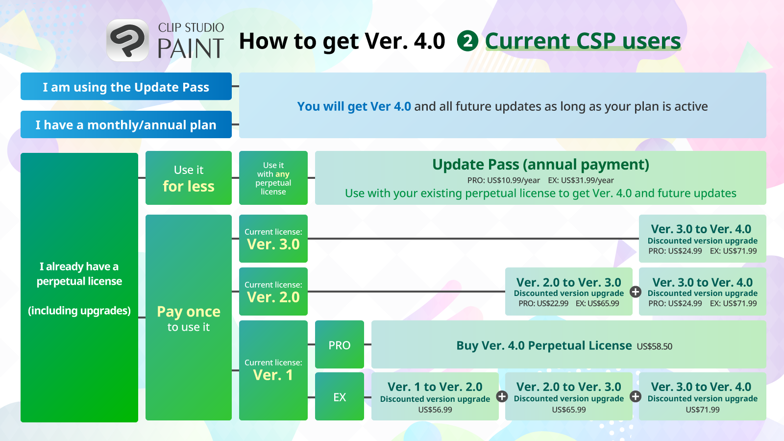 >>7779929With the perpetual license, you don't get any updates past the initial one X.0The subscription model is usually better if you care for new features and shit. but If you, say, buy 3.0 perpetual pass, thats all you get. You will have to buy a license again if you want the 4.0 or whatever version they com up next, and still if you want updates you will have to sub anyway, but you already spent money on a perpetual license, so its just smarter to get the subscription from the get go.I swear they have the most stupid subscription model ever created by human, its so bad they need flowcharts to explain it.