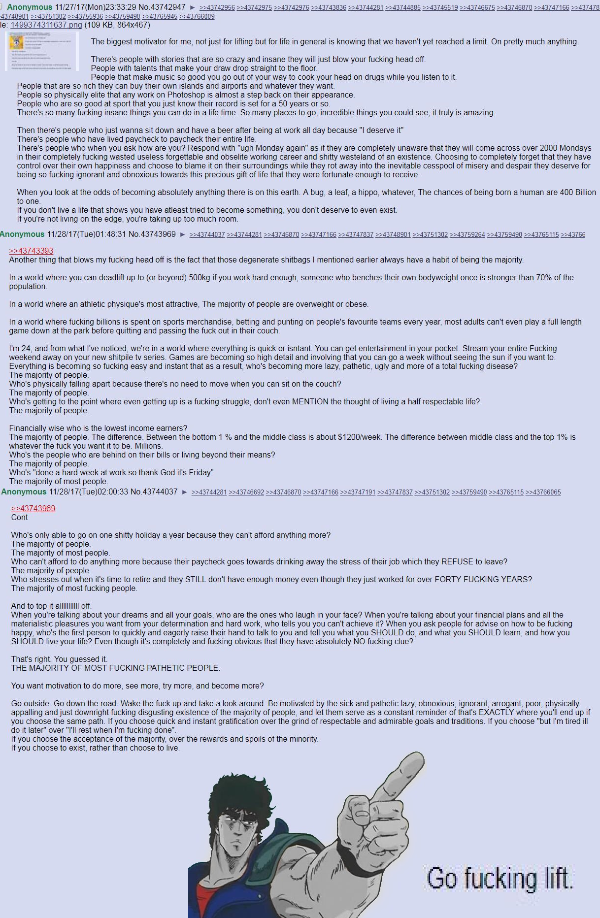>>7809702Thanks for the motivation (?). Though, I think the whole idea of >The chances of being born a human are 400 Billion to one.is such a useless thing to consider. Everything is a miracle in that case, and such types of mindless optimism tend to have a negative impact on my psyche. Makes me feel like the person I'm talking to is retarded. I refuse to lift, and would rather spend my time drawing muscular people due to what I physically can't do. It's more than nothing lol Being an overweight artist who sits on their ass drawing things that makes others drool or are excited is more of a dream than the temporary feeling of looking fit for my own reflection's sake. That person is 24. I was 24 nearly a decade ago. I don't need this inexperienced mentality telling me I can make it. I'm fine where I am and I'm pretty alright with it. Again, thanks for the well-meant encouragement though. Our world is fucked, realistically, and no amount of lifting will change that. But drawing sexy men can. (for me)